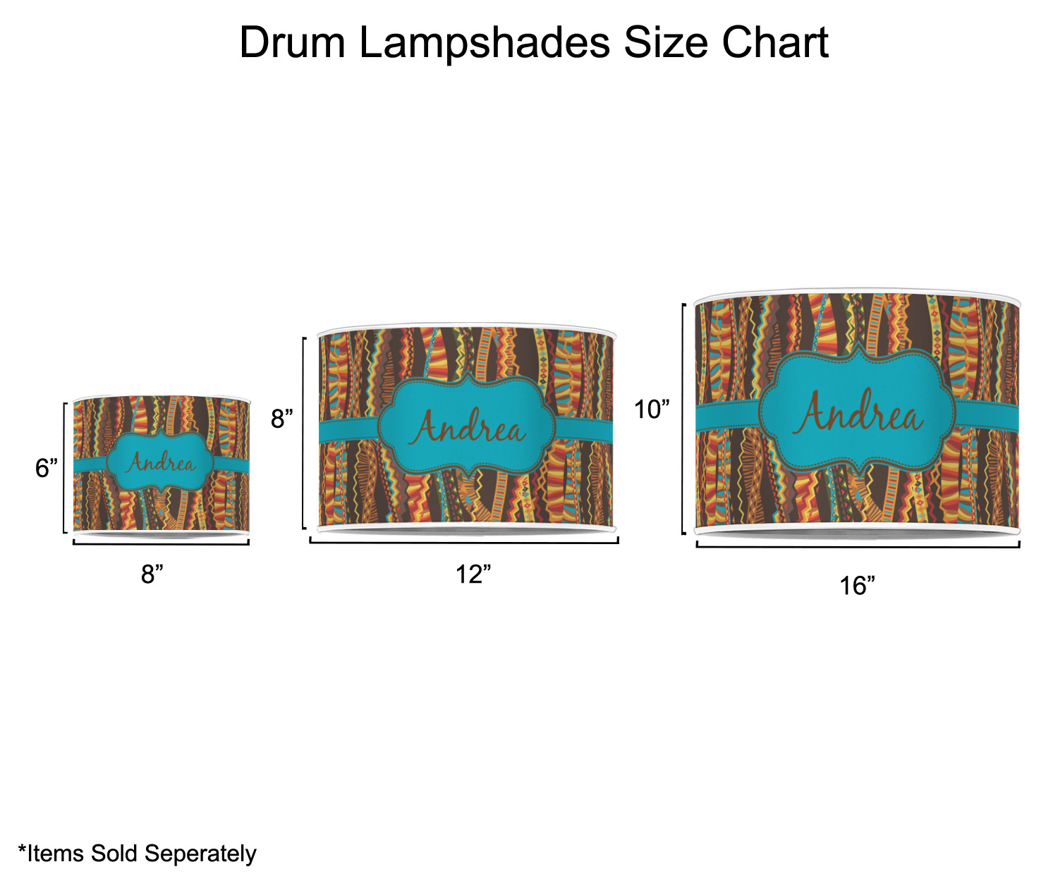 Our customized lamp shades also come in 3 different sizes: 8", 12" and 16", measuring at 8" in diameter by 6" tall, 12" in diameter by 8" tall, and 16" in diameter by 10" tall, respectively.