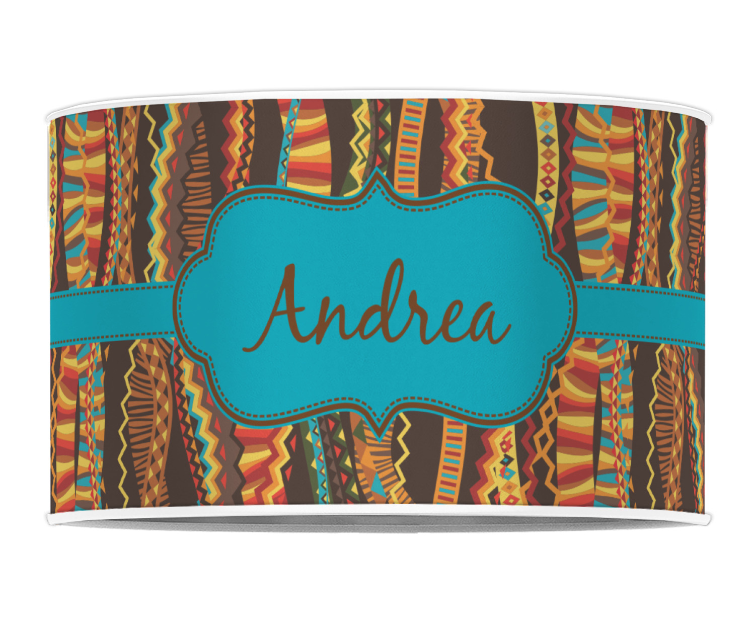 Traditional meets trendy in this fun, tribal design. This design is composed of wavy ribbons covered in stripes, chevron, triangles- you name it!- in a variety of warm colors with teal accents.