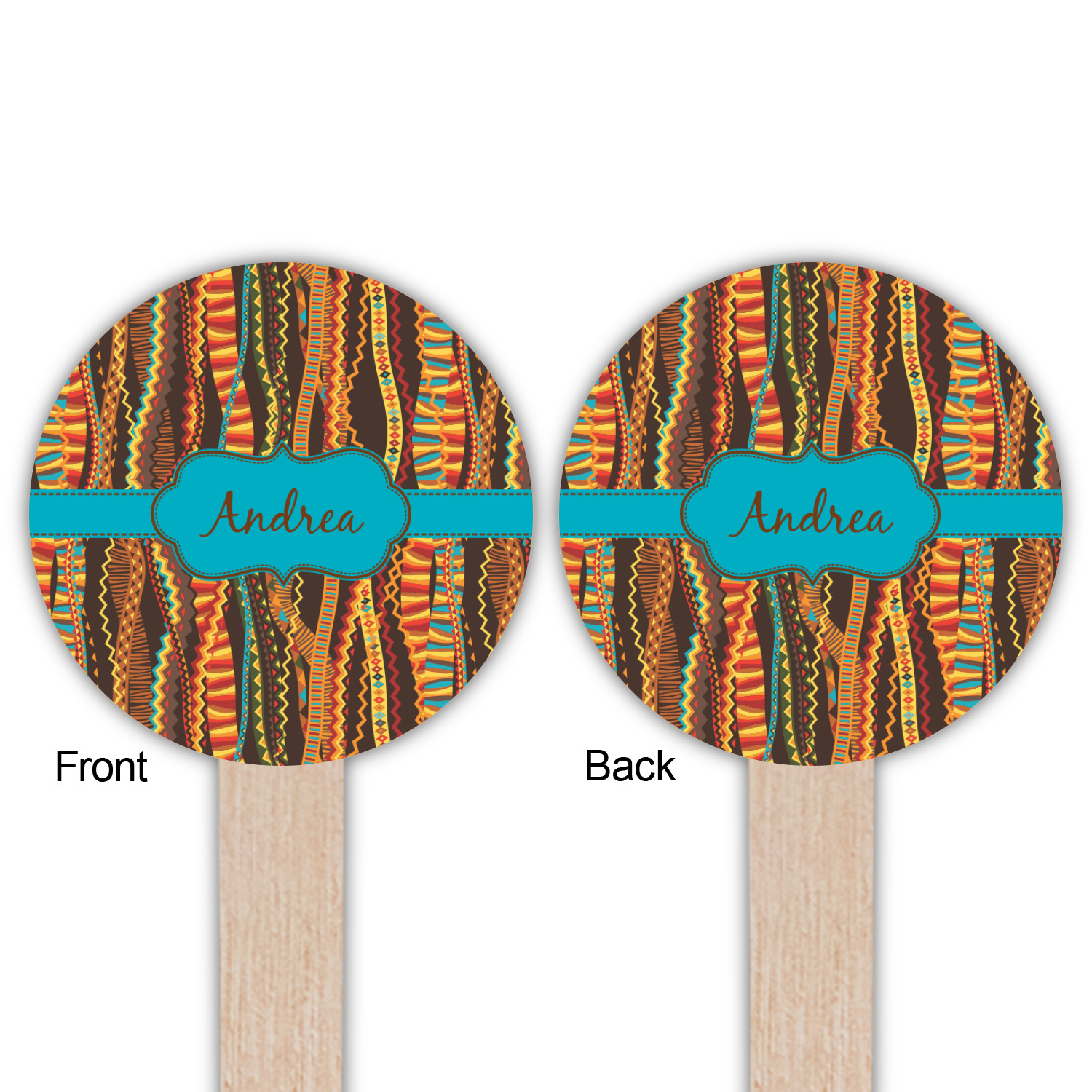 Traditional meets trendy in this fun, tribal design. This design is composed of wavy ribbons covered in stripes, chevron, triangles- you name it!- in a variety of warm colors with teal accents.