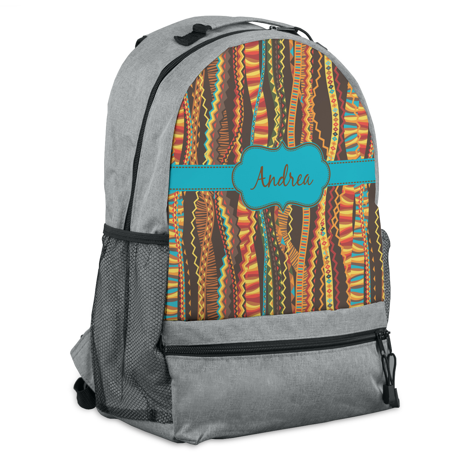 Traditional meets trendy in this fun, tribal design. This design is composed of wavy ribbons covered in stripes, chevron, triangles- you name it!- in a variety of warm colors with teal accents.