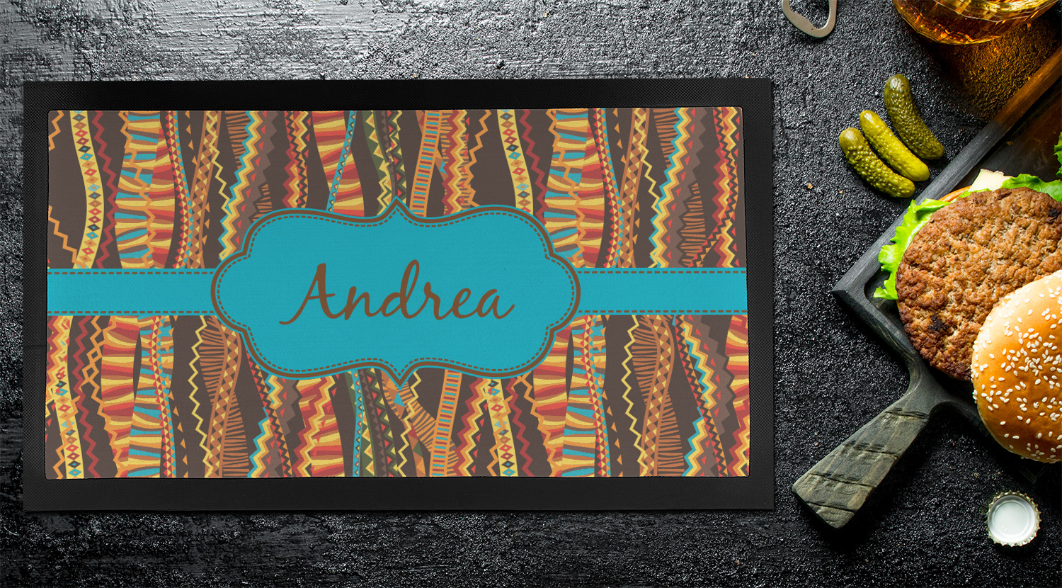 Traditional meets trendy in this fun, tribal design. This design is composed of wavy ribbons covered in stripes, chevron, triangles- you name it!- in a variety of warm colors with teal accents.