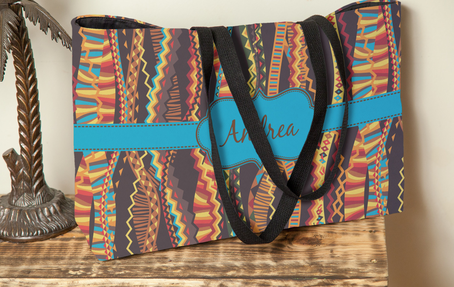These beach totes are handmade here in the USA. Fabric is printed with your design. The tote is then sewn from the fabric pieces, lining and handles added.