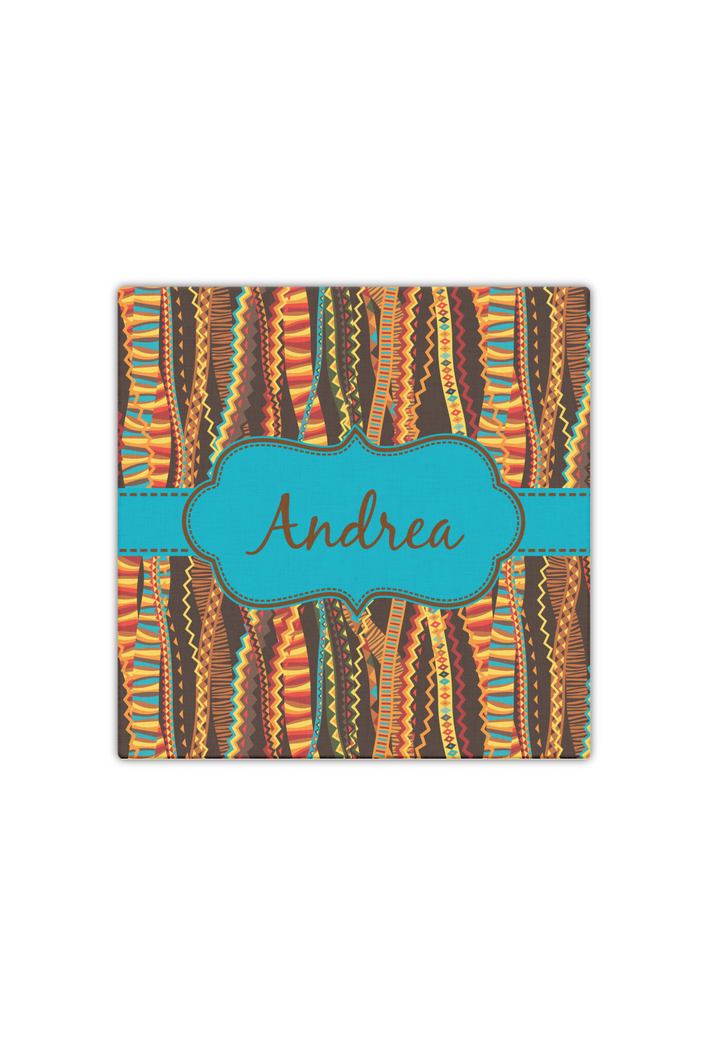 Traditional meets trendy in this fun, tribal design. This design is composed of wavy ribbons covered in stripes, chevron, triangles- you name it!- in a variety of warm colors with teal accents.