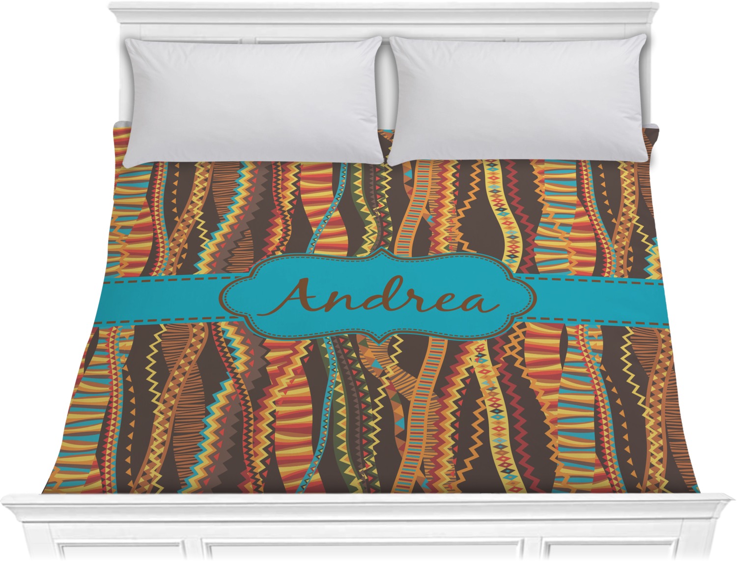 Traditional meets trendy in this fun, tribal design. This design is composed of wavy ribbons covered in stripes, chevron, triangles- you name it!- in a variety of warm colors with teal accents.
