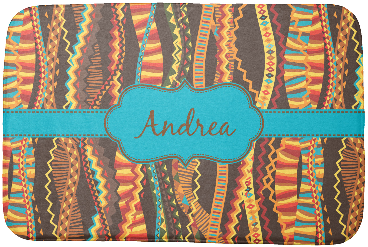 Traditional meets trendy in this fun, tribal design. This design is composed of wavy ribbons covered in stripes, chevron, triangles- you name it!- in a variety of warm colors with teal accents.