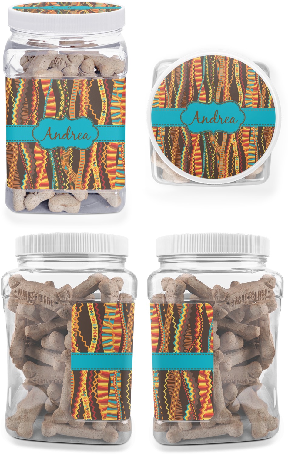 This half gallon jar, made from a sturdy plastic, is the perfect way to keep treats from any naughty pet paws, while still keeping them ready on hand for when your pup performs an impressive trick. This dog cookie jar features a screw-on, white lid that displays your personalized design on a vinyl sticker. We apply another customized sticker that wraps around the front and sides of the jar. Our dog treat jar also has indentations on the rear ends of the sides, which allows for convenient handling, and its square frame allows for easy storage.