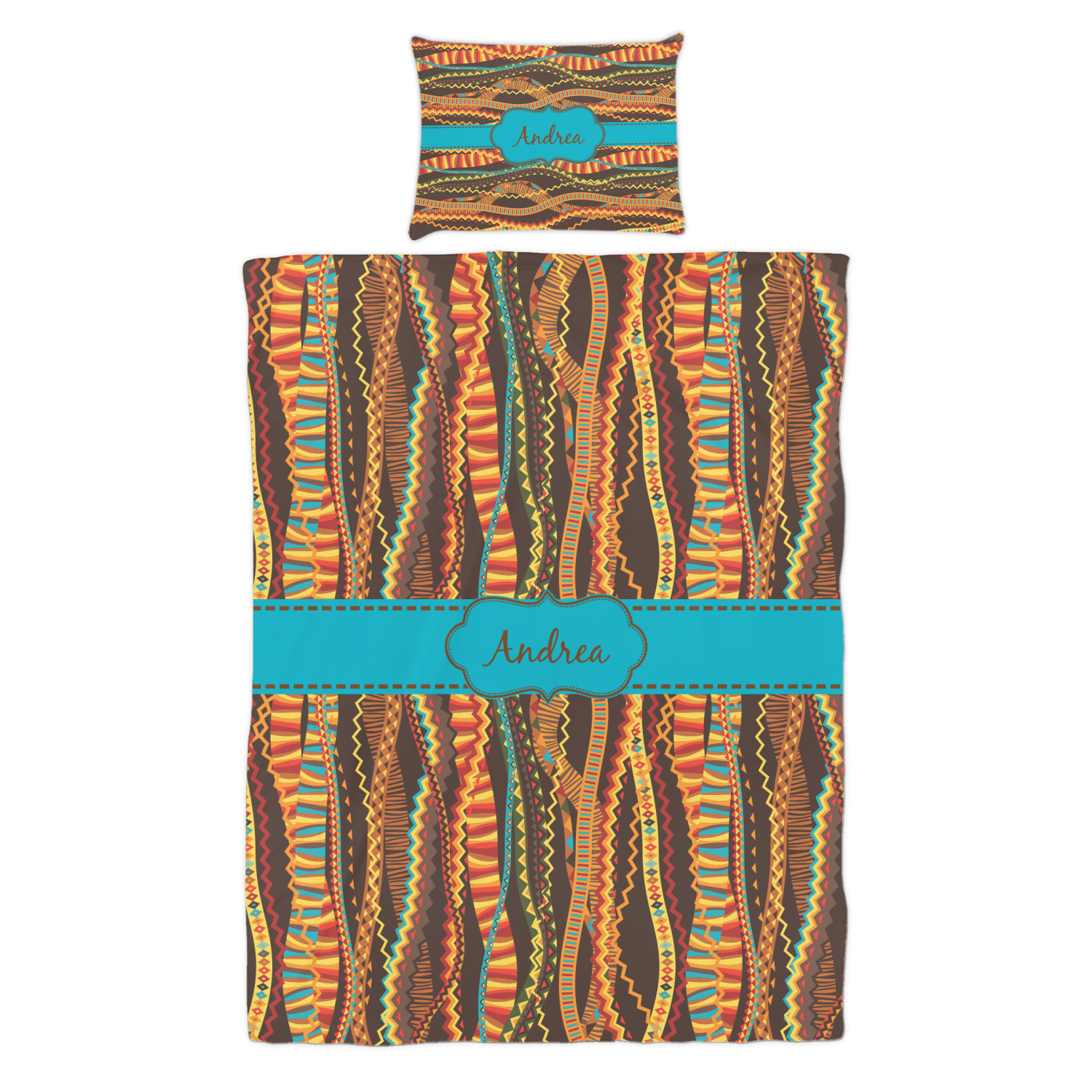 Traditional meets trendy in this fun, tribal design. This design is composed of wavy ribbons covered in stripes, chevron, triangles- you name it!- in a variety of warm colors with teal accents.