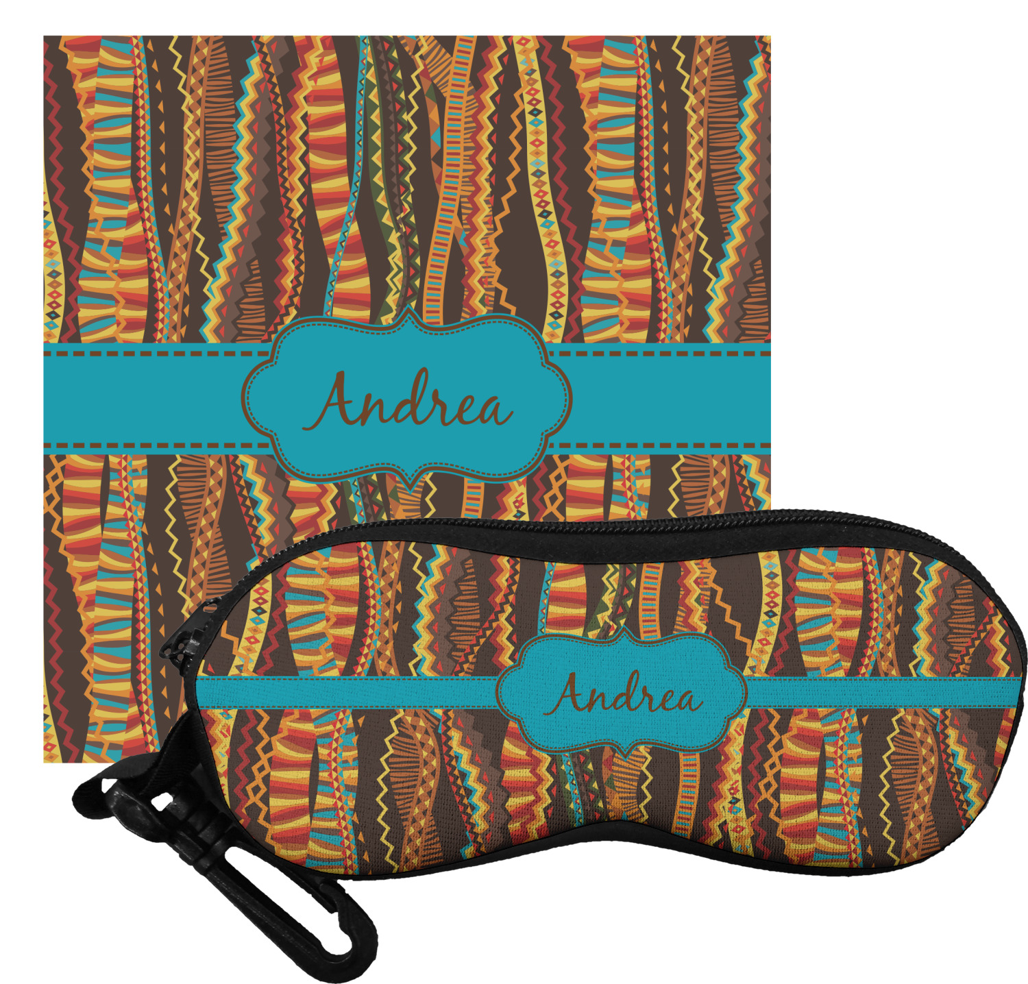 The cases have the design on both sides, a black zipper, and clips for hanging on a belt buckle or purse strap and also include matching lens cloths.