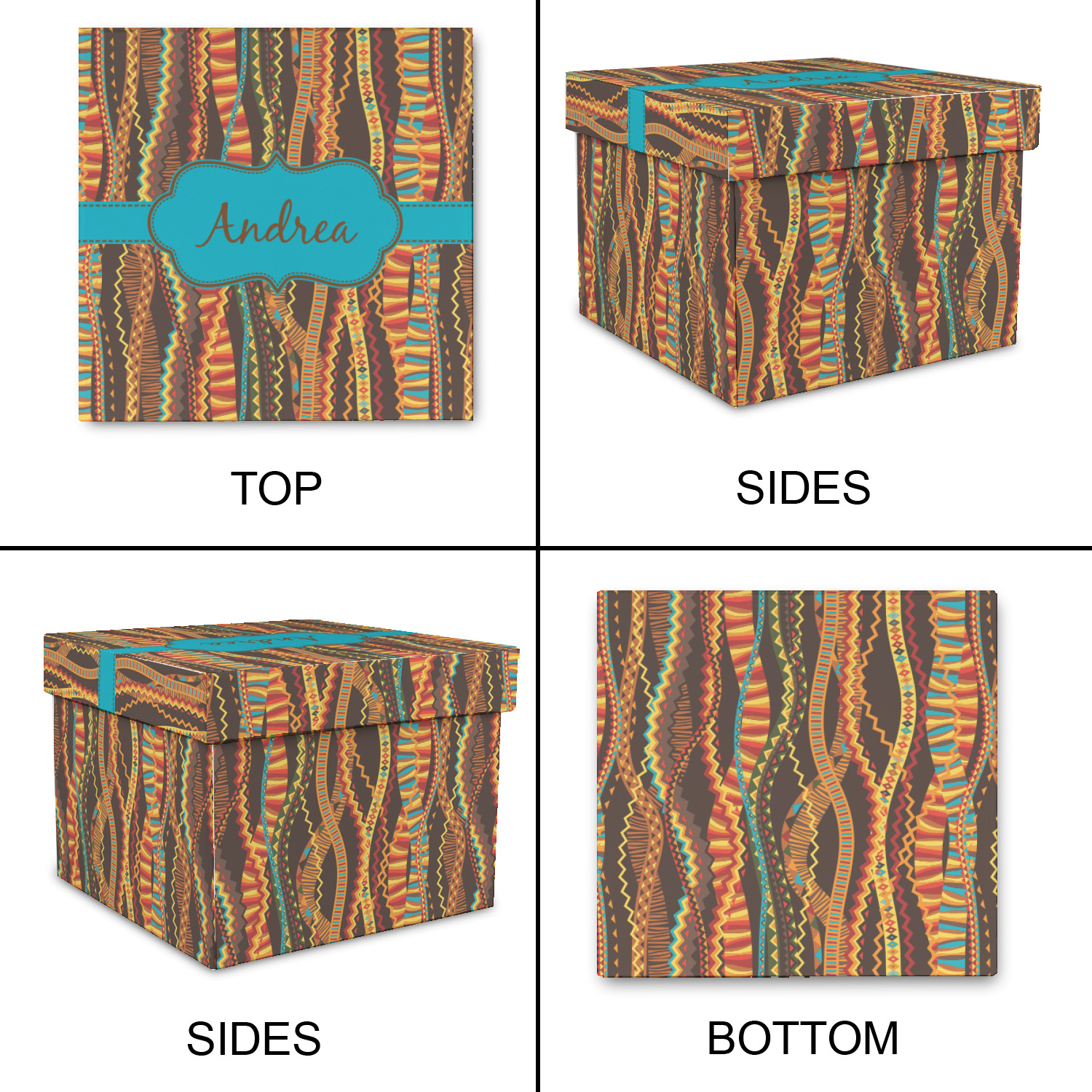 Traditional meets trendy in this fun, tribal design. This design is composed of wavy ribbons covered in stripes, chevron, triangles- you name it!- in a variety of warm colors with teal accents.