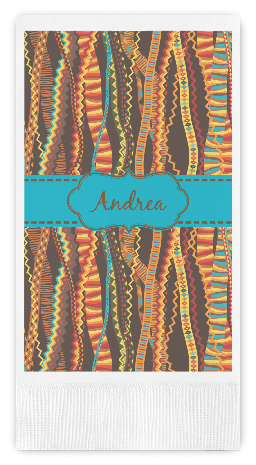 Traditional meets trendy in this fun, tribal design. This design is composed of wavy ribbons covered in stripes, chevron, triangles- you name it!- in a variety of warm colors with teal accents.