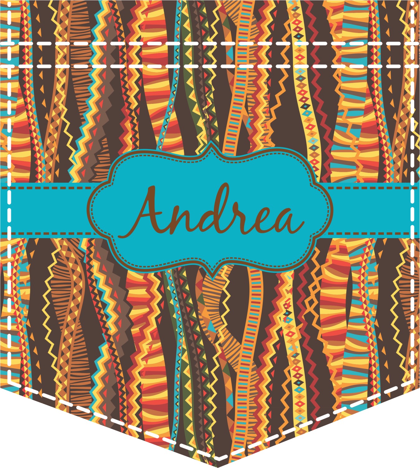 Traditional meets trendy in this fun, tribal design. This design is composed of wavy ribbons covered in stripes, chevron, triangles- you name it!- in a variety of warm colors with teal accents.