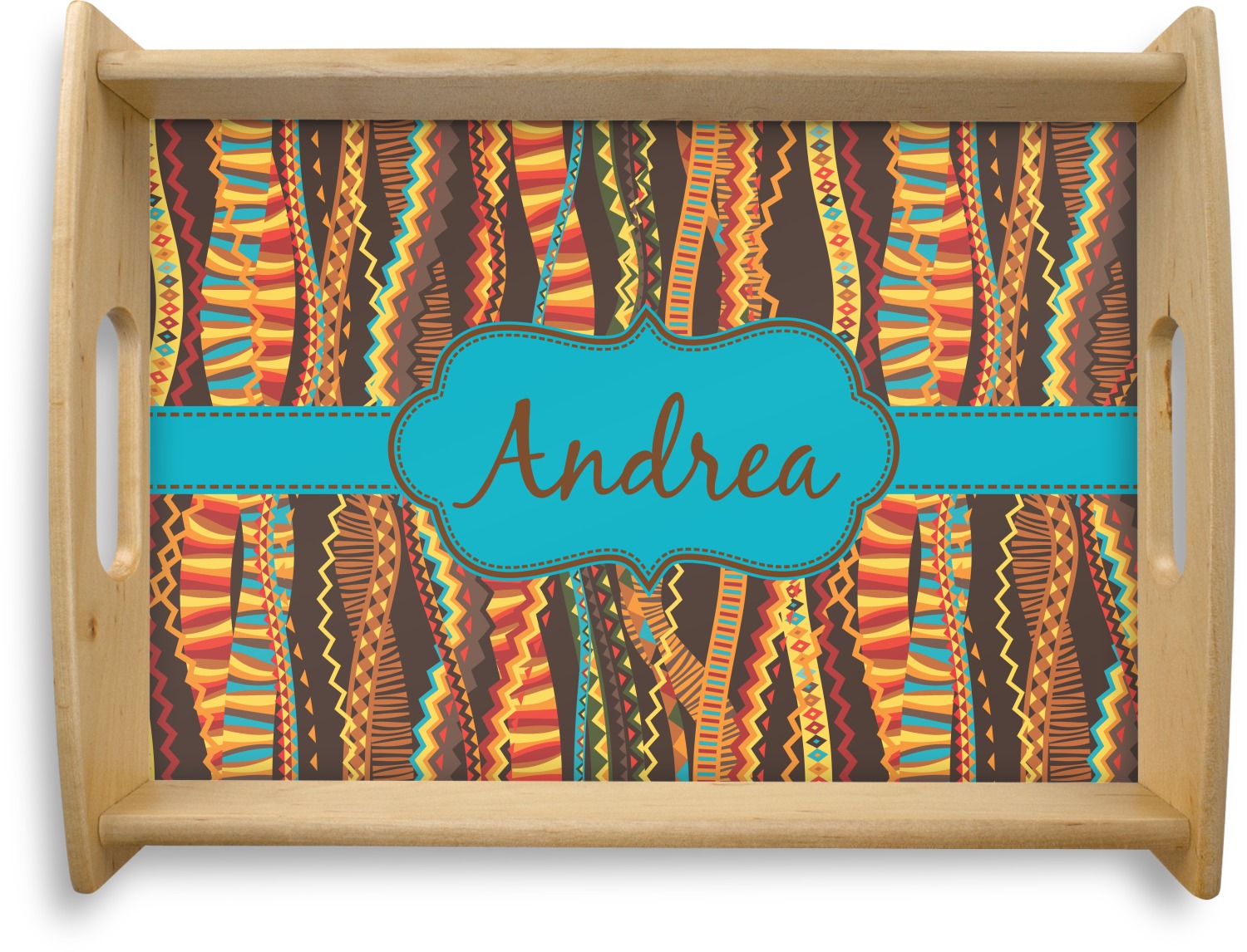 Traditional meets trendy in this fun, tribal design. This design is composed of wavy ribbons covered in stripes, chevron, triangles- you name it!- in a variety of warm colors with teal accents.