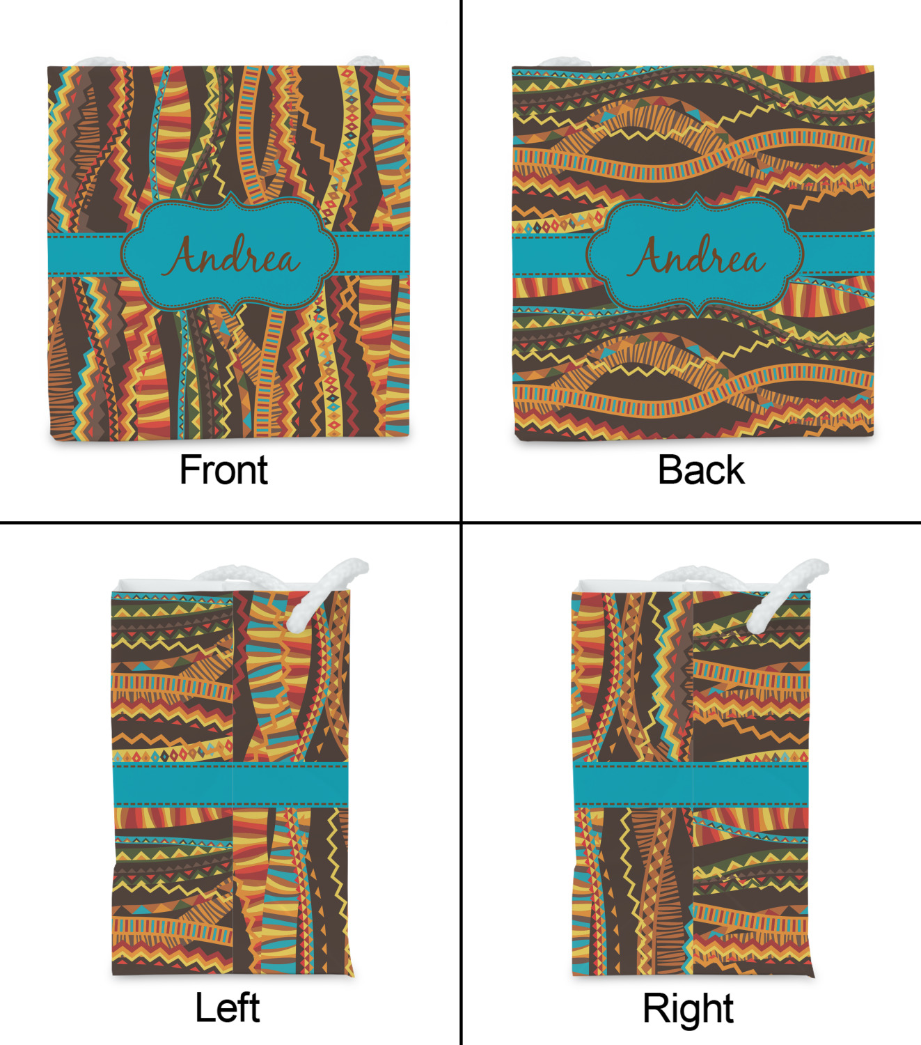 Traditional meets trendy in this fun, tribal design. This design is composed of wavy ribbons covered in stripes, chevron, triangles- you name it!- in a variety of warm colors with teal accents.
