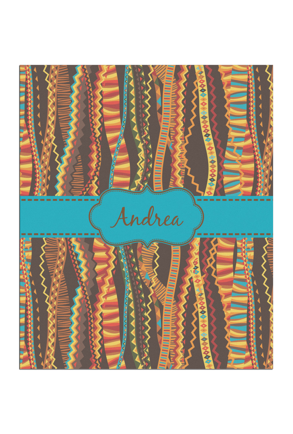 Traditional meets trendy in this fun, tribal design. This design is composed of wavy ribbons covered in stripes, chevron, triangles- you name it!- in a variety of warm colors with teal accents.