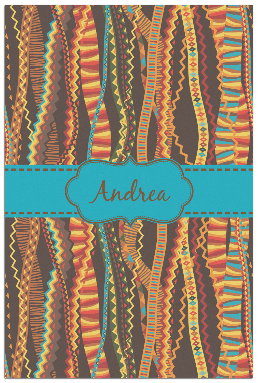 Traditional meets trendy in this fun, tribal design. This design is composed of wavy ribbons covered in stripes, chevron, triangles- you name it!- in a variety of warm colors with teal accents.