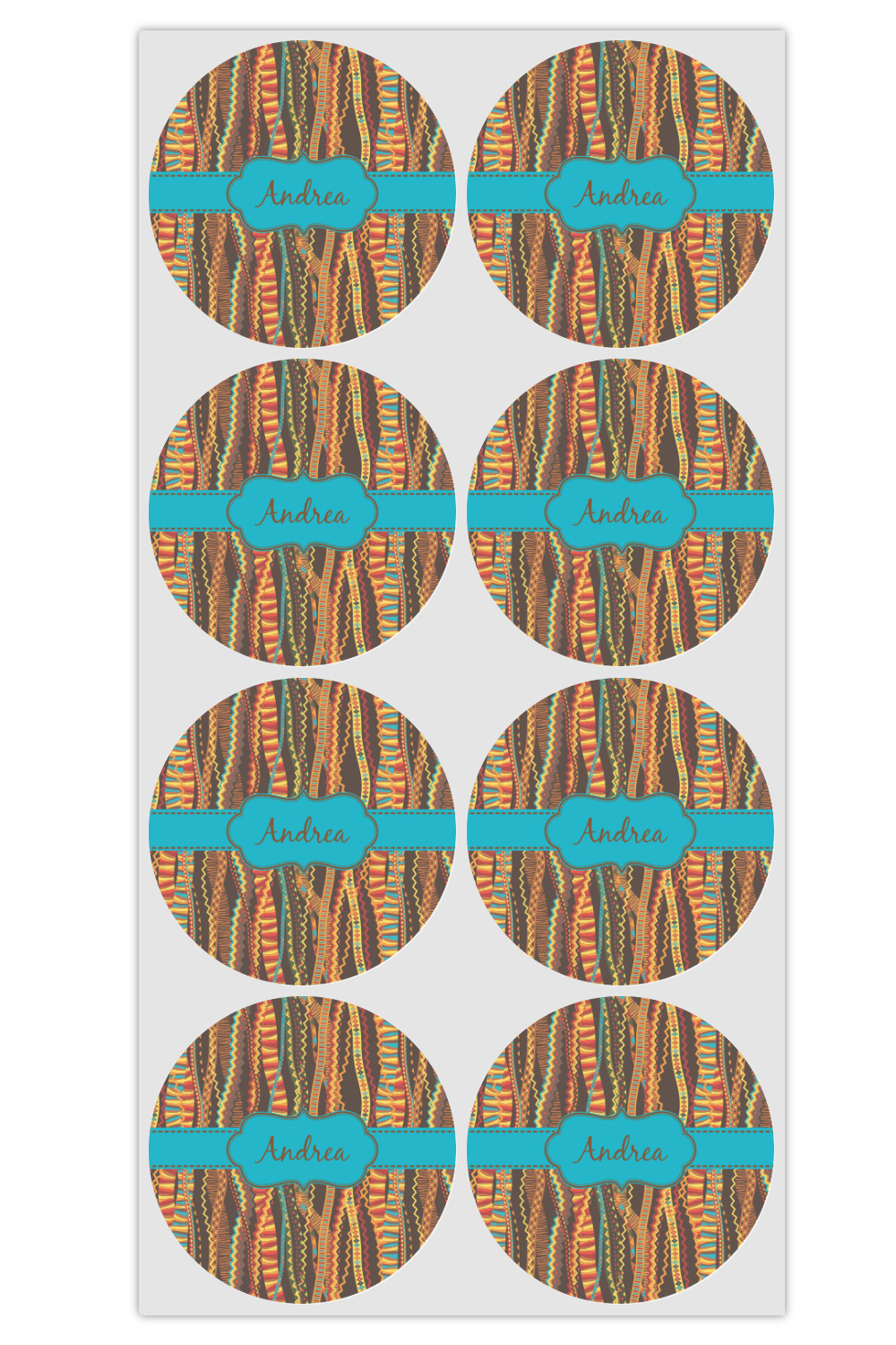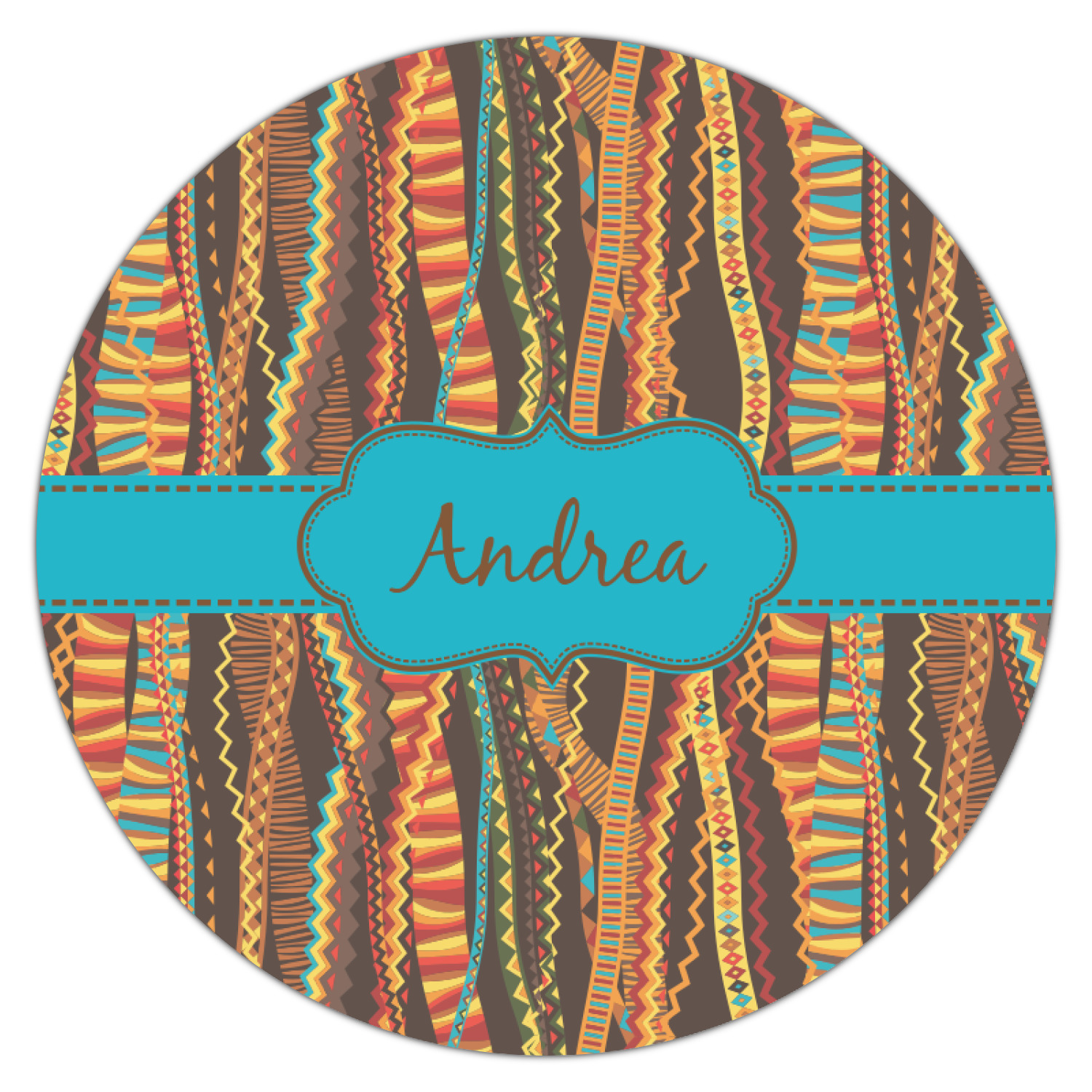Traditional meets trendy in this fun, tribal design. This design is composed of wavy ribbons covered in stripes, chevron, triangles- you name it!- in a variety of warm colors with teal accents.