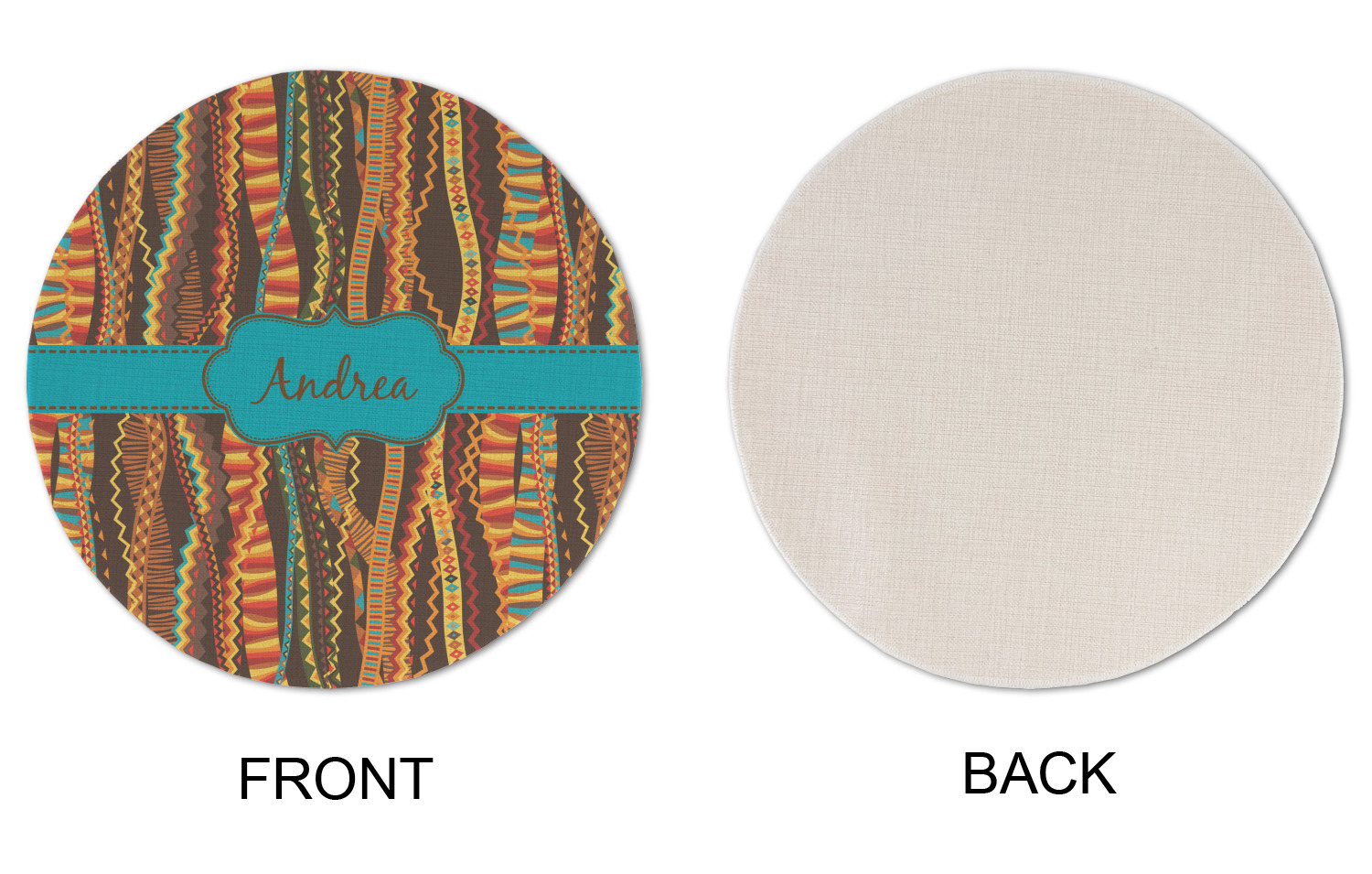 Traditional meets trendy in this fun, tribal design. This design is composed of wavy ribbons covered in stripes, chevron, triangles- you name it!- in a variety of warm colors with teal accents.