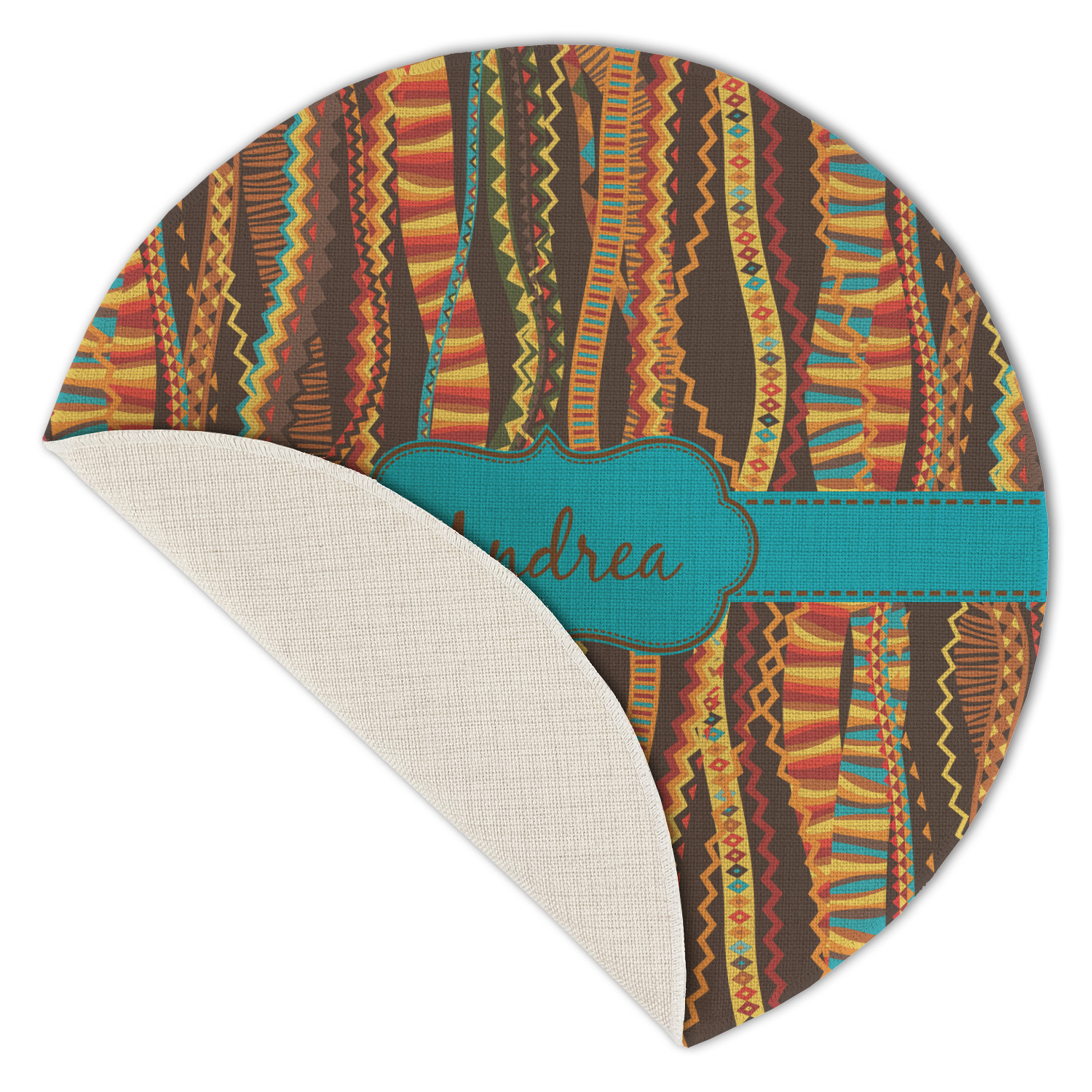 Traditional meets trendy in this fun, tribal design. This design is composed of wavy ribbons covered in stripes, chevron, triangles- you name it!- in a variety of warm colors with teal accents.