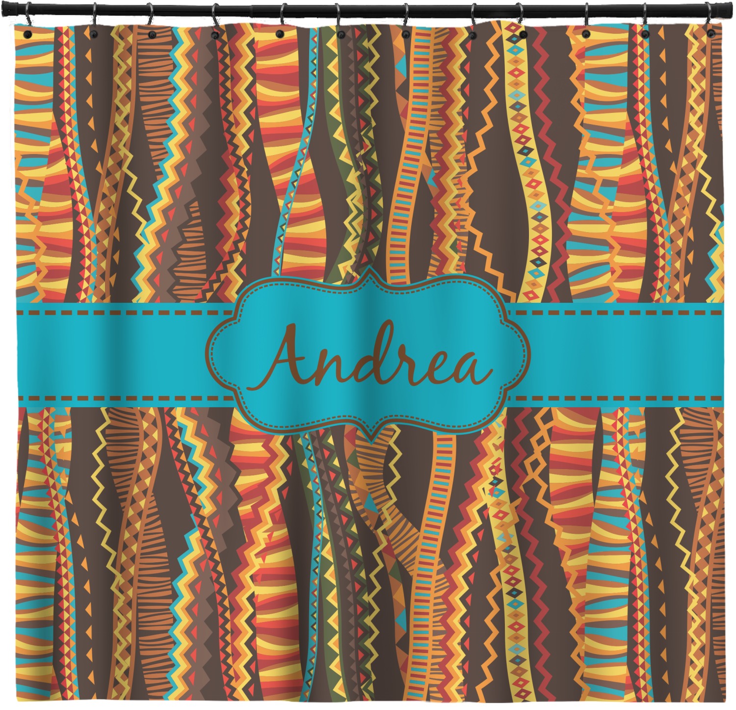 Traditional meets trendy in this fun, tribal design. This design is composed of wavy ribbons covered in stripes, chevron, triangles- you name it!- in a variety of warm colors with teal accents.