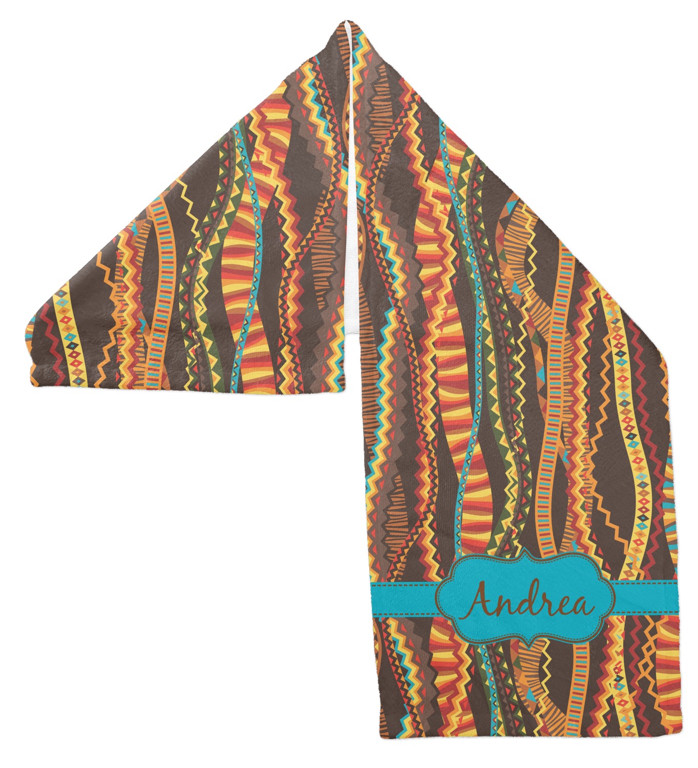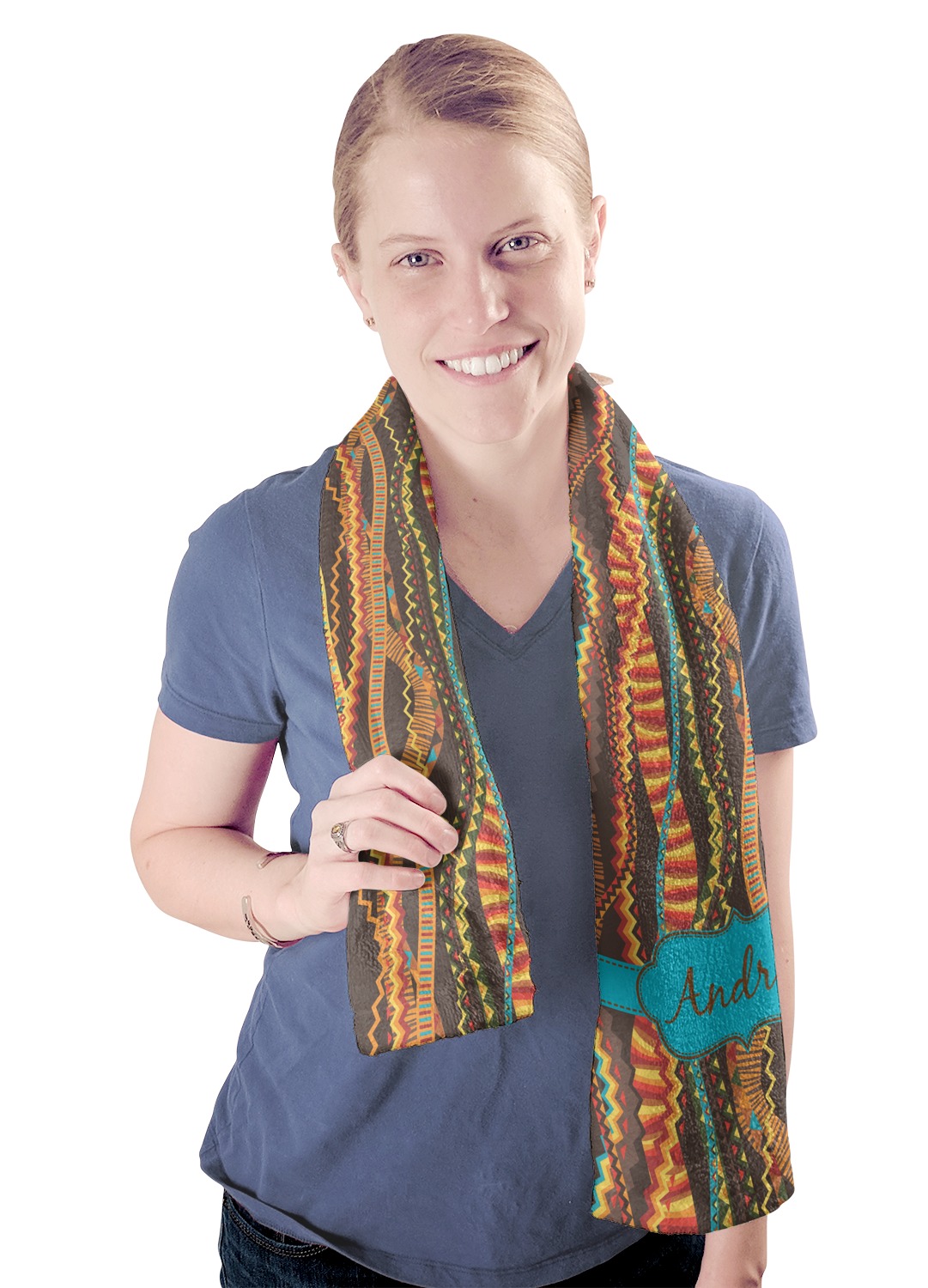 Traditional meets trendy in this fun, tribal design. This design is composed of wavy ribbons covered in stripes, chevron, triangles- you name it!- in a variety of warm colors with teal accents.