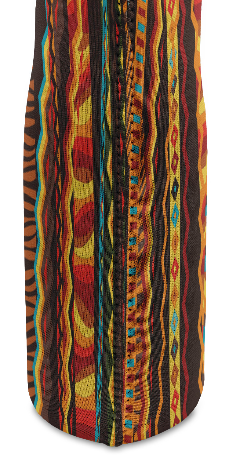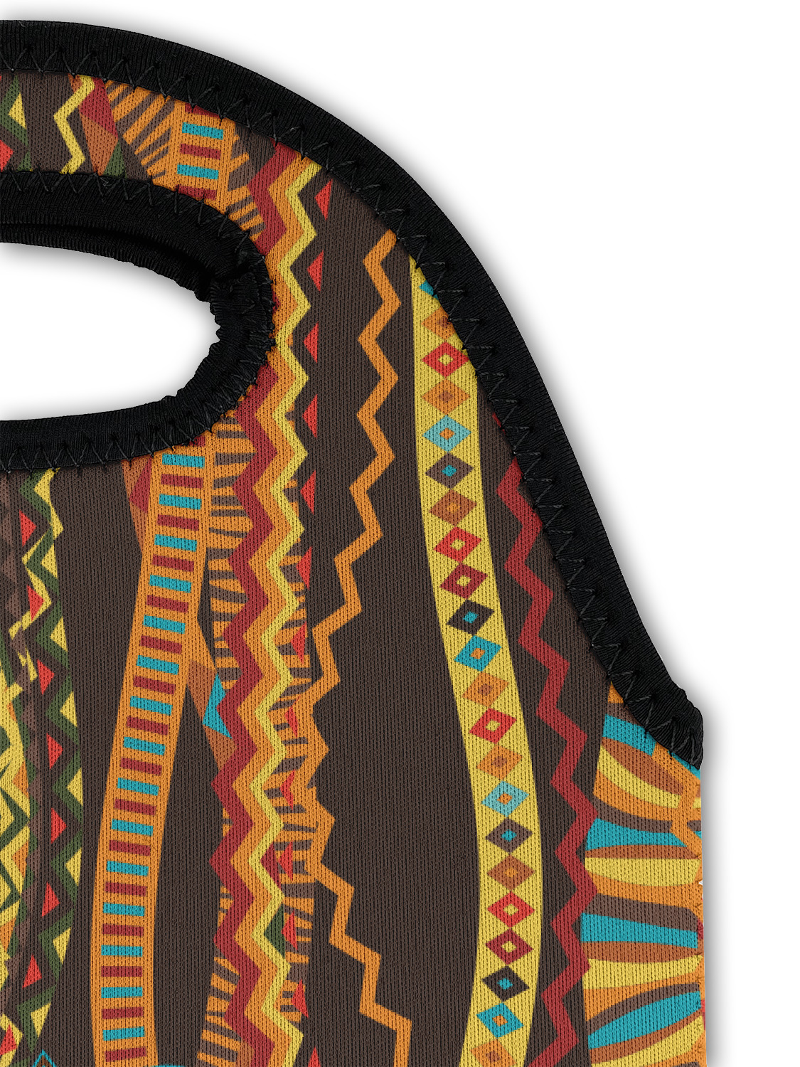 Traditional meets trendy in this fun, tribal design. This design is composed of wavy ribbons covered in stripes, chevron, triangles- you name it!- in a variety of warm colors with teal accents.