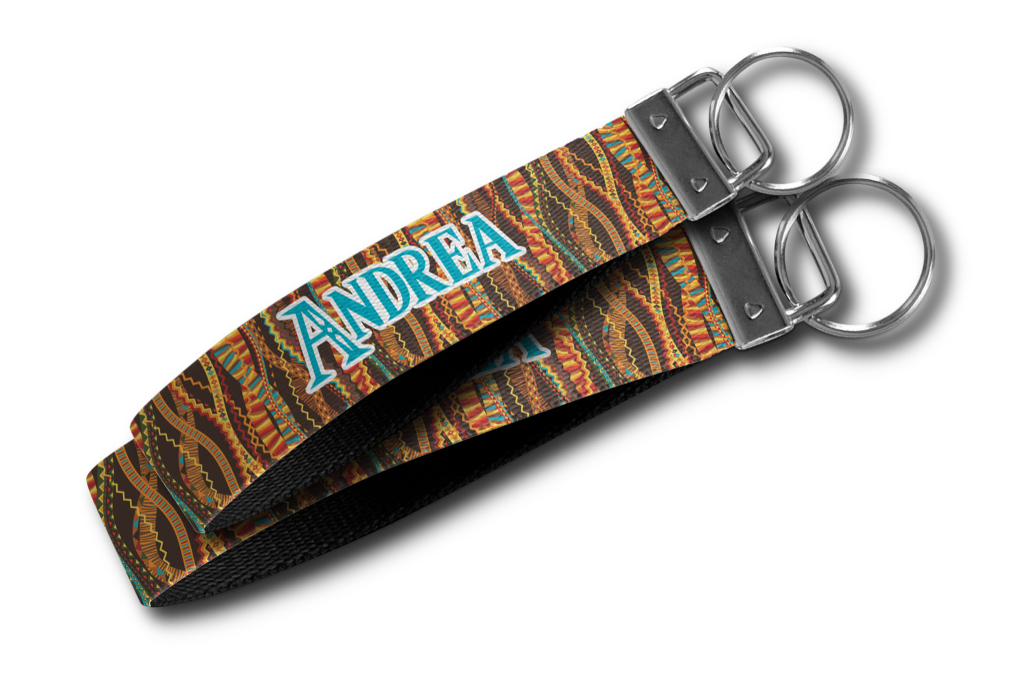 These key fob keychains are made from a polyester weave, right here in the USA. They feature a silver, metal clasp, attached to a round keyring. The piece gives the personalized wristlet a beautiful, finished look. Your customized design is printed on the outside of the keychain strap. We carry these wristlets in two sizes: small, which is 5 inches in width, and large, which is 5.5 inches in width.