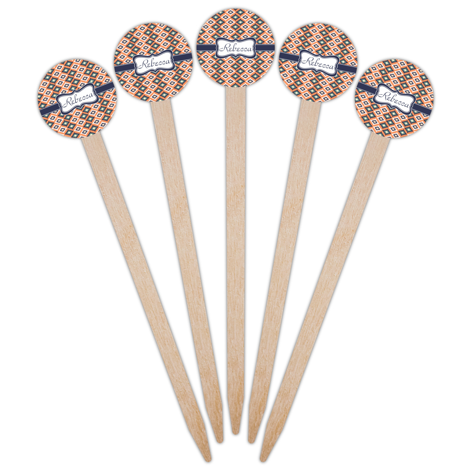 This fun, tribal design features stitched diamonds in cream and blue, scattered across a pale orange background. The effect is rather mesmerizing.