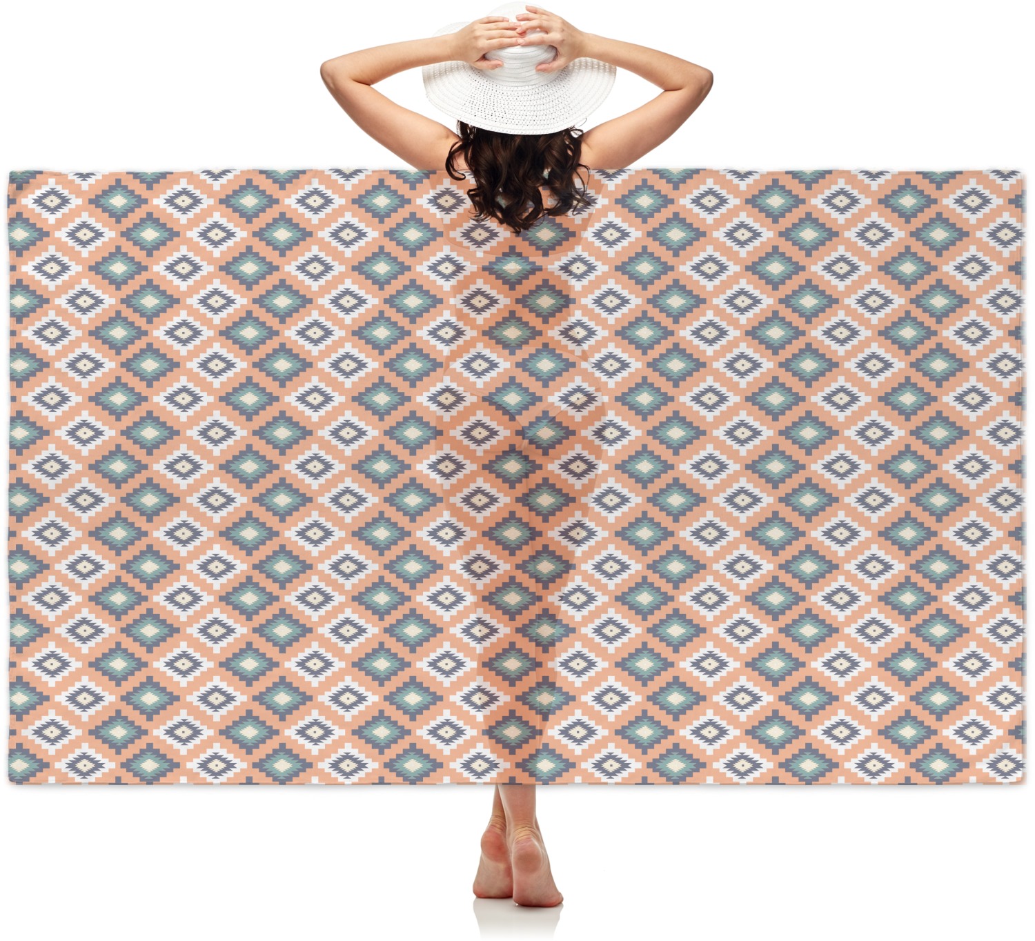 This fun, tribal design features stitched diamonds in cream and blue, scattered across a pale orange background. The effect is rather mesmerizing.