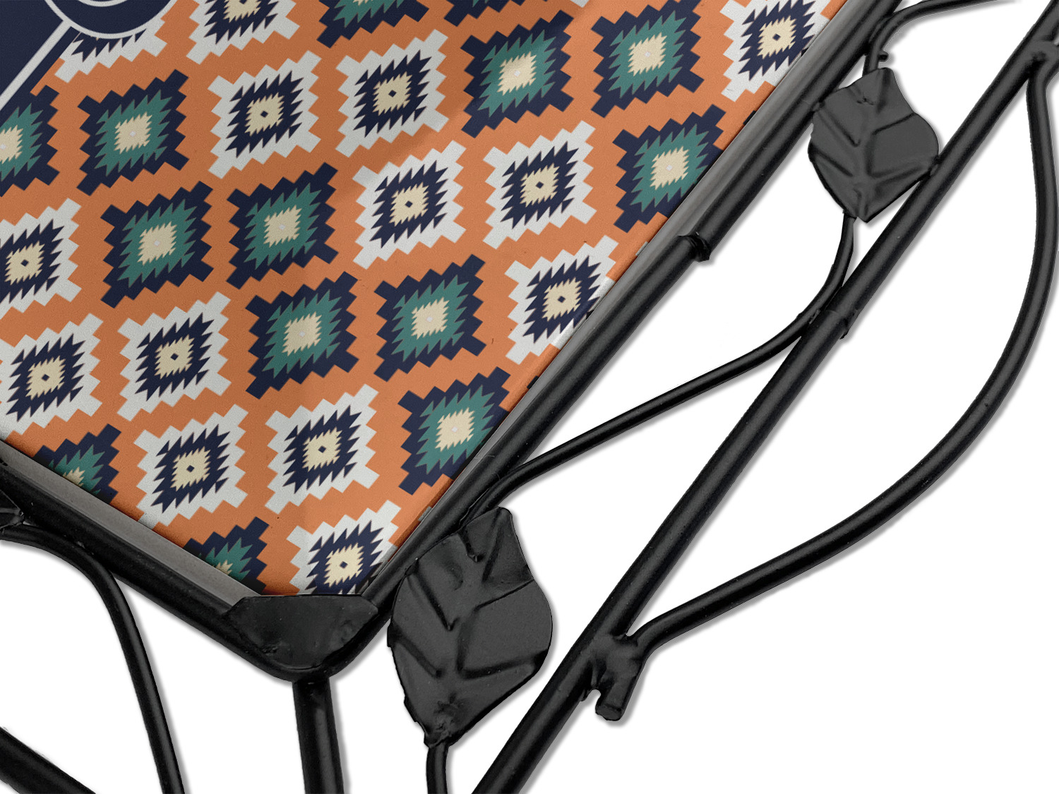 Our square trivets are made from a durable, wrought iron. This model features 4 small half circles, one on each corner, and a larger ring of iron that circles the central, customized tile. Each of the 4 corners has a round foot on its bottom for stability. This trivet is 8.75 by 8.75 inches, but the central tile measures at 6 inches on both sides.