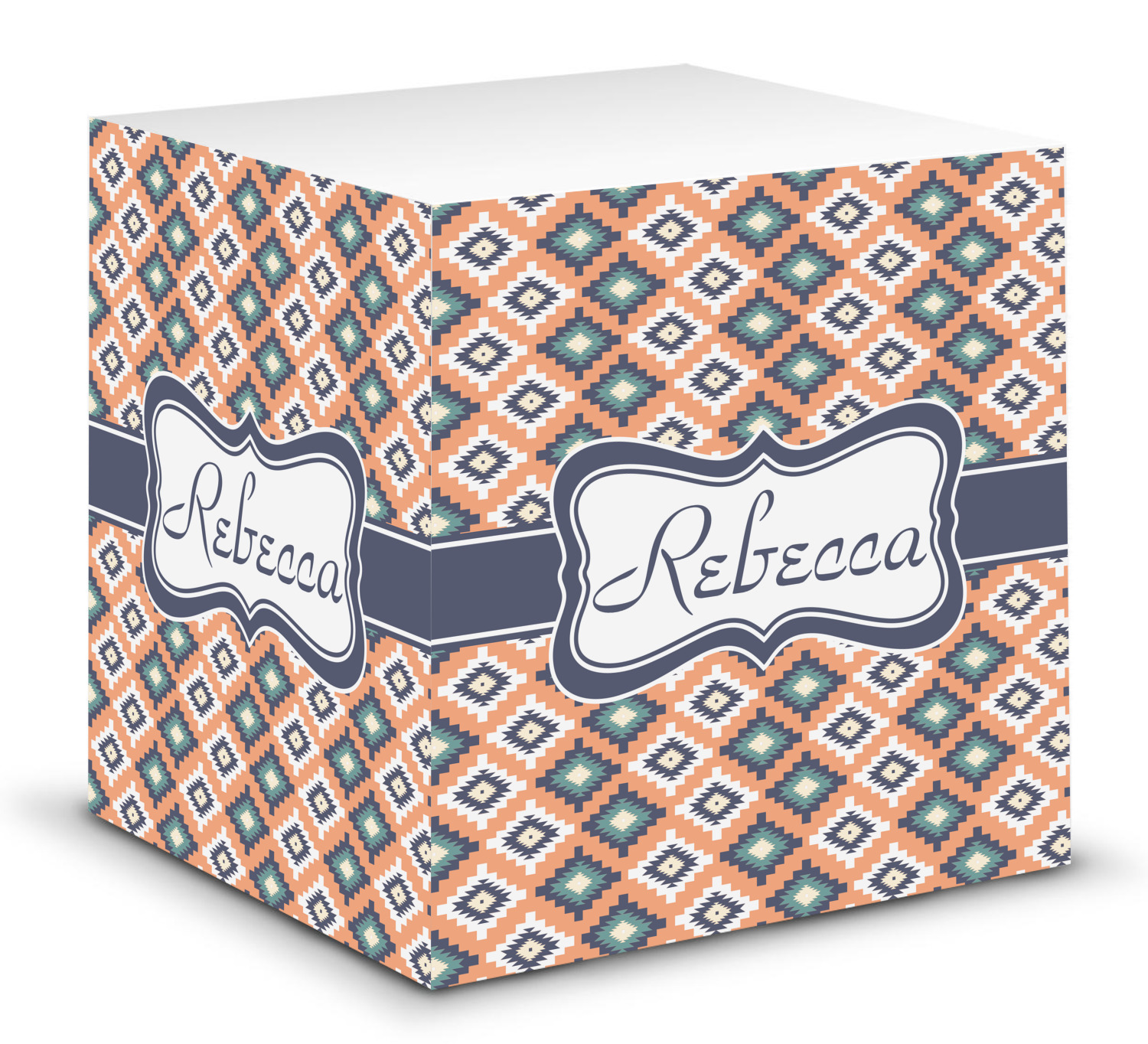 This note cube features 700 sheets of matte, white paper. Each sheet measures at 3.5 by 3.5 inches and has an adhesive strip at its top. Your personalized design is displayed on all four edges of the sticky pad.