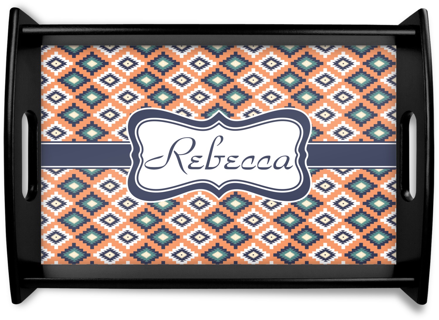 This serving tray with handles features square edges and two rounded sides, creating a very modern look. Each side is fabricated from a beautifully cut, natural wood. The bottom of the interior of the tray displays your customized design in bright, vibrant color. The tray is sold in both a black color and a natural wood look. Each variation of the wood serving tray has two sizes: Small, which is 14" x 10" x 2.25", and Large, which is 19.5" x 13.5" x 2.75".