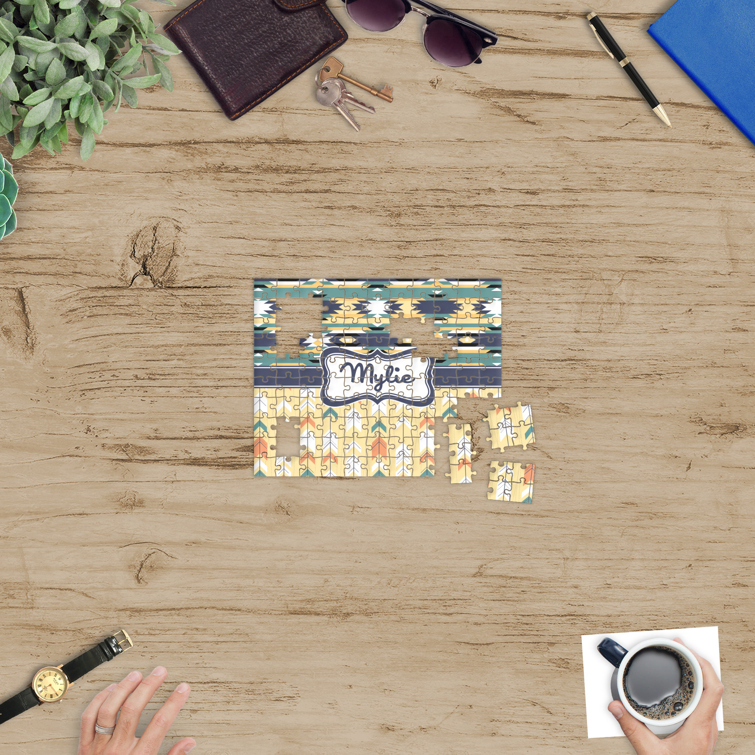 Depending on the look you are trying to achieve, you can add; a thematic pattern or background, with a photo in a frame and text or personalization to your puzzle. Basically if you can imagine it, you can design it!