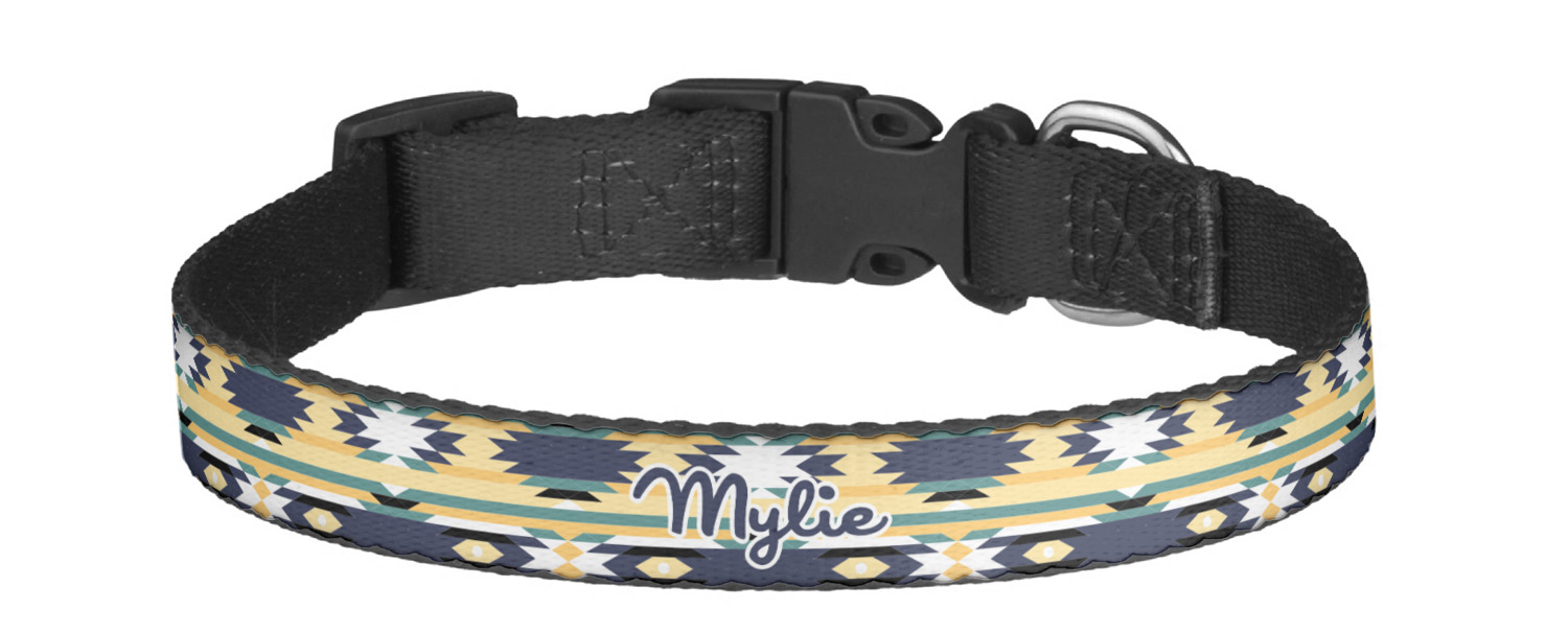 This sturdy collar, made from a durable nylon weave, will outlive your dog's episodes of excited tugging and pulling. Courtesy of its thick plastic buckle and adjuster, this collar is adjustable and accommodating of any dog. Structurally, the collar is a single piece of nylon weave that is sewn together, and features a solid metal loop where you can attach a leash or dog tag. We print and display your dog's name and pattern across the middle of the personalized dog collar.