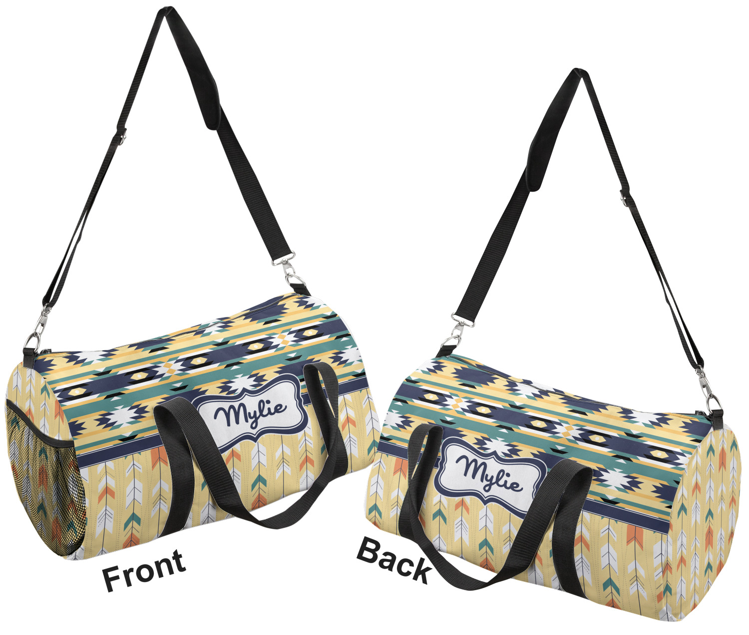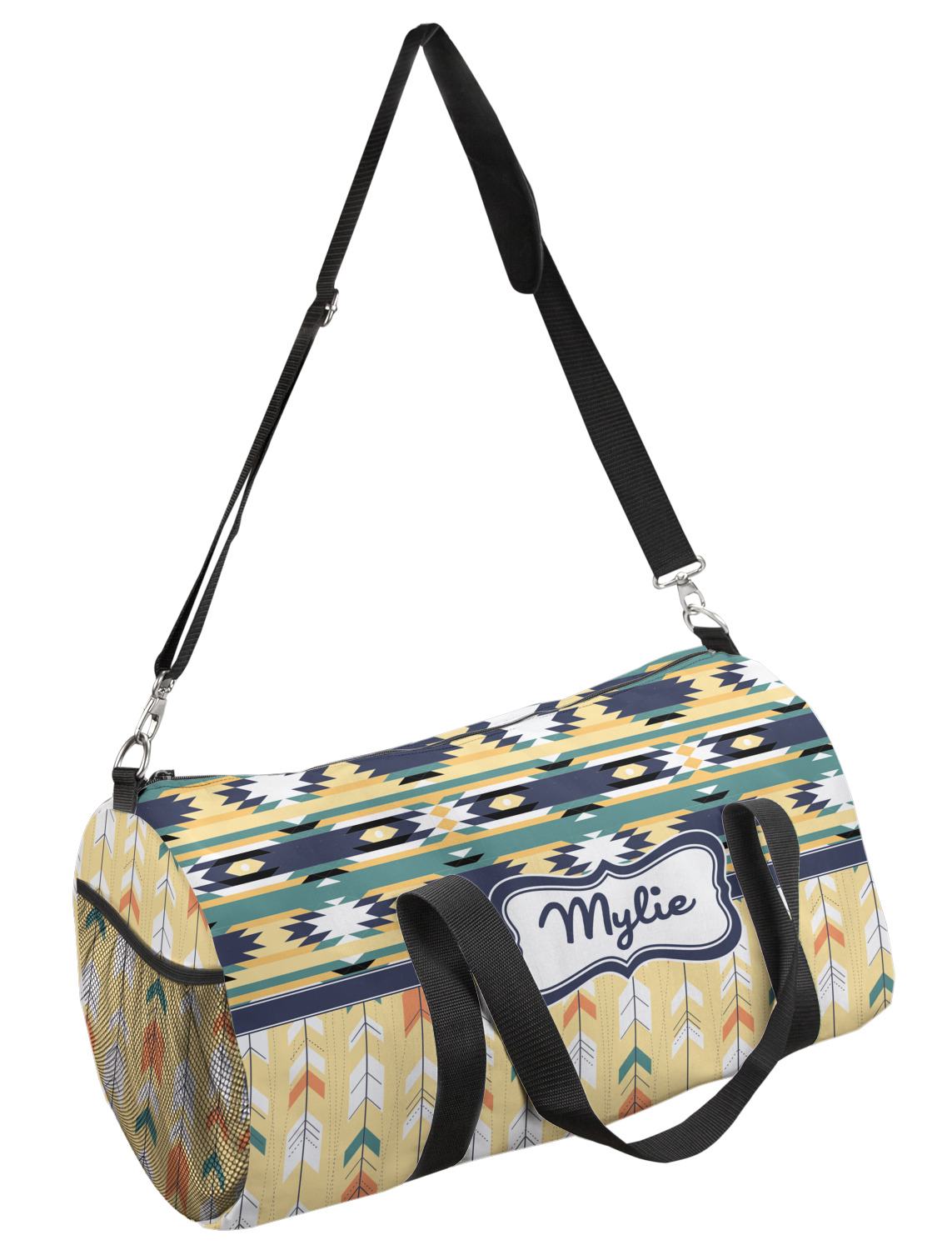 This duffle is a sturdy bag made of a canvas material. It comes in two sizes: Small (19"W x 9.5"H x 9.5"D) and Large (23"W x 12"H x 12"D). The bag is a cylindrical shape with a black adjustable strap and two handles. On one side is an elastic pouch to put a waterbottle or other small item. Your product will be sublimated with your design and is able to be designed on the front, back, and sides. Be sure to remember that the straps may cut into parts of your design if you upload your own artwork.
