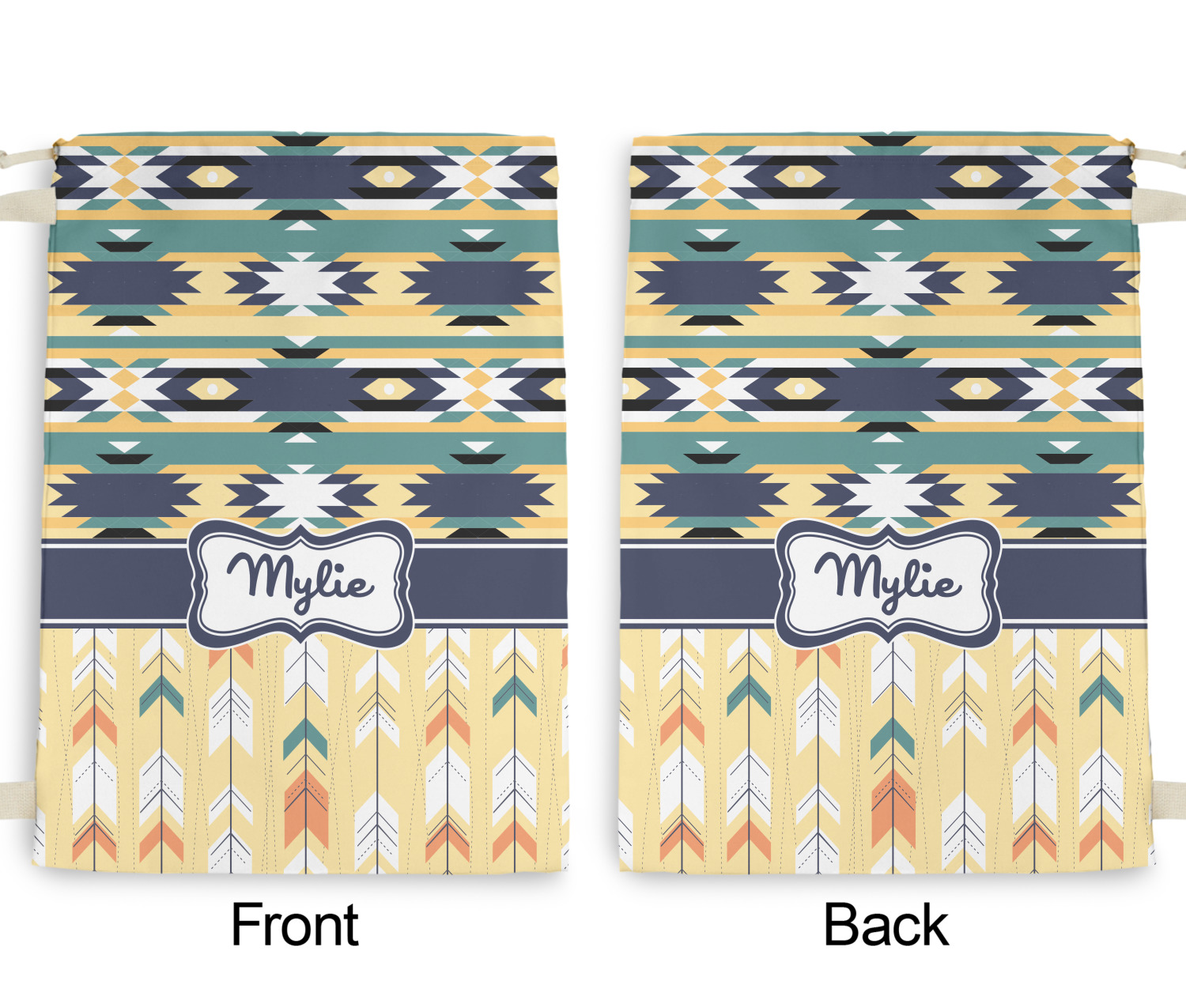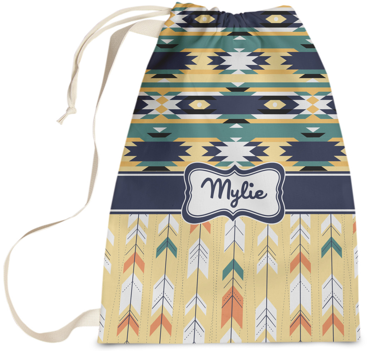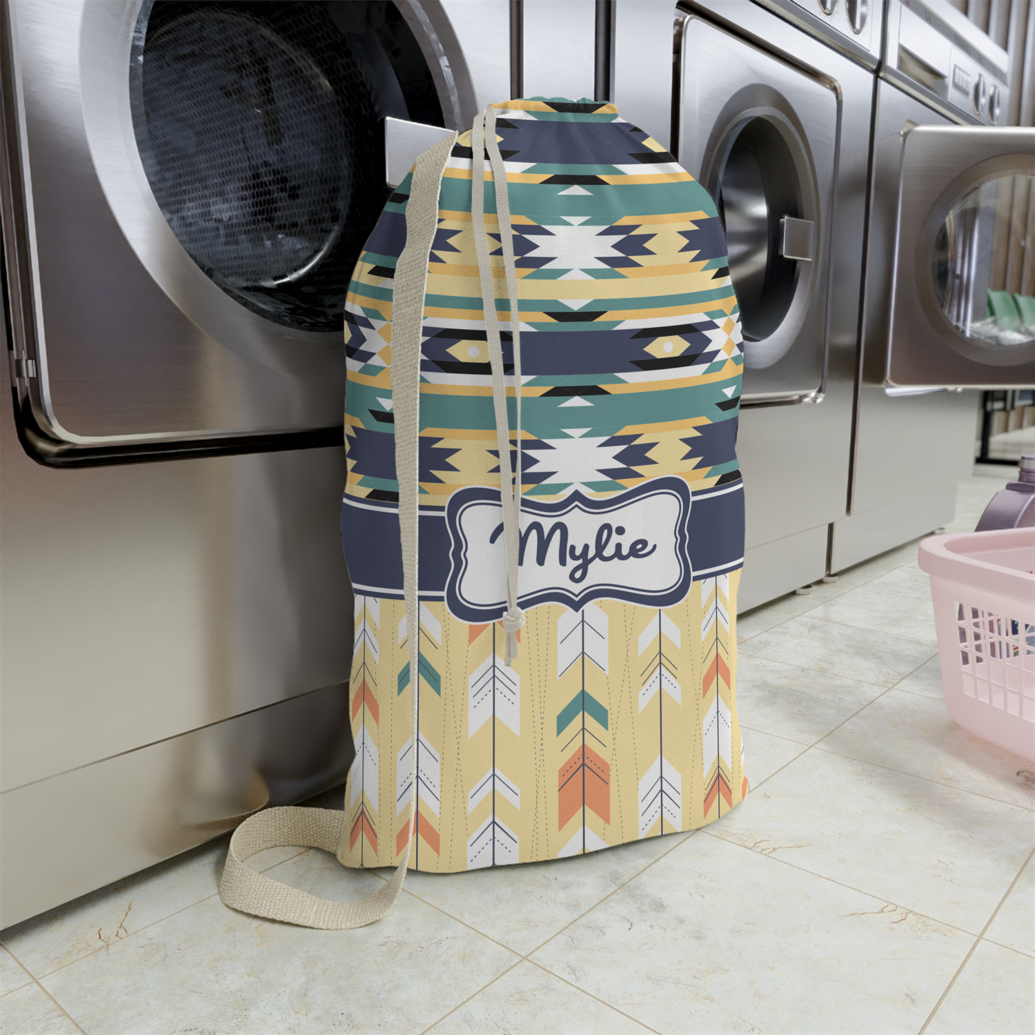Carry your laundry in style with these customized laundry bags. Available in two sizes, featuring a natural colored woven strap and a cinch cord, these bags hold a lot of clothes or anything else you want to fit in them.