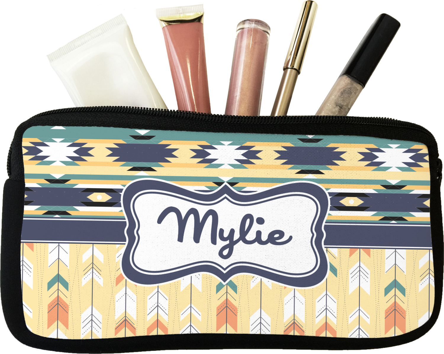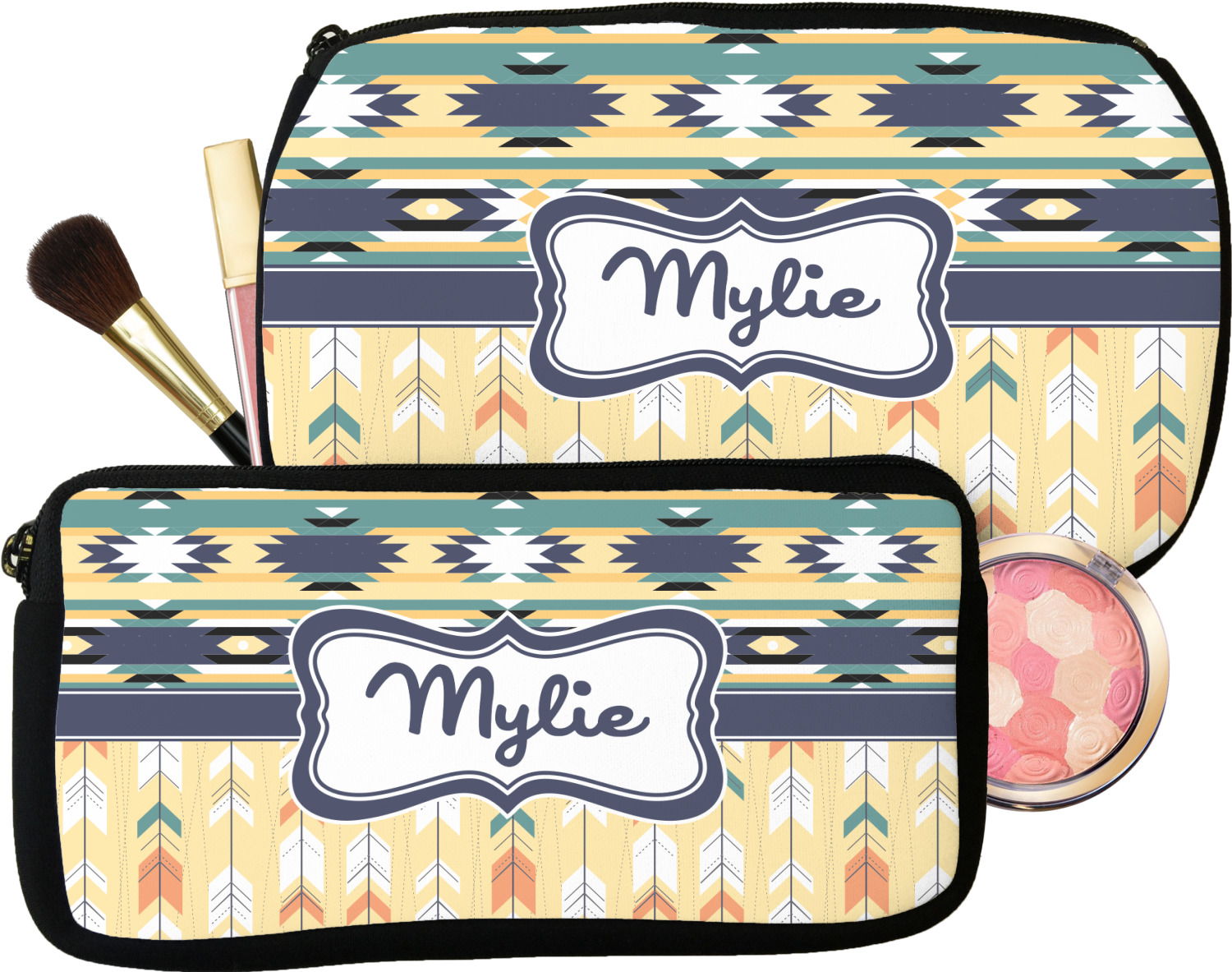 Our personalized makeup bags are available in many different designs, patterns and colors - so you are sure to find one that will love. They are made of neoprene (same material as wet-suits) and thus are water resistant, so spillages in your makeup bag will not end up all over you purse. They are customized on one side and are black on the other side and the zipper is black as well.
