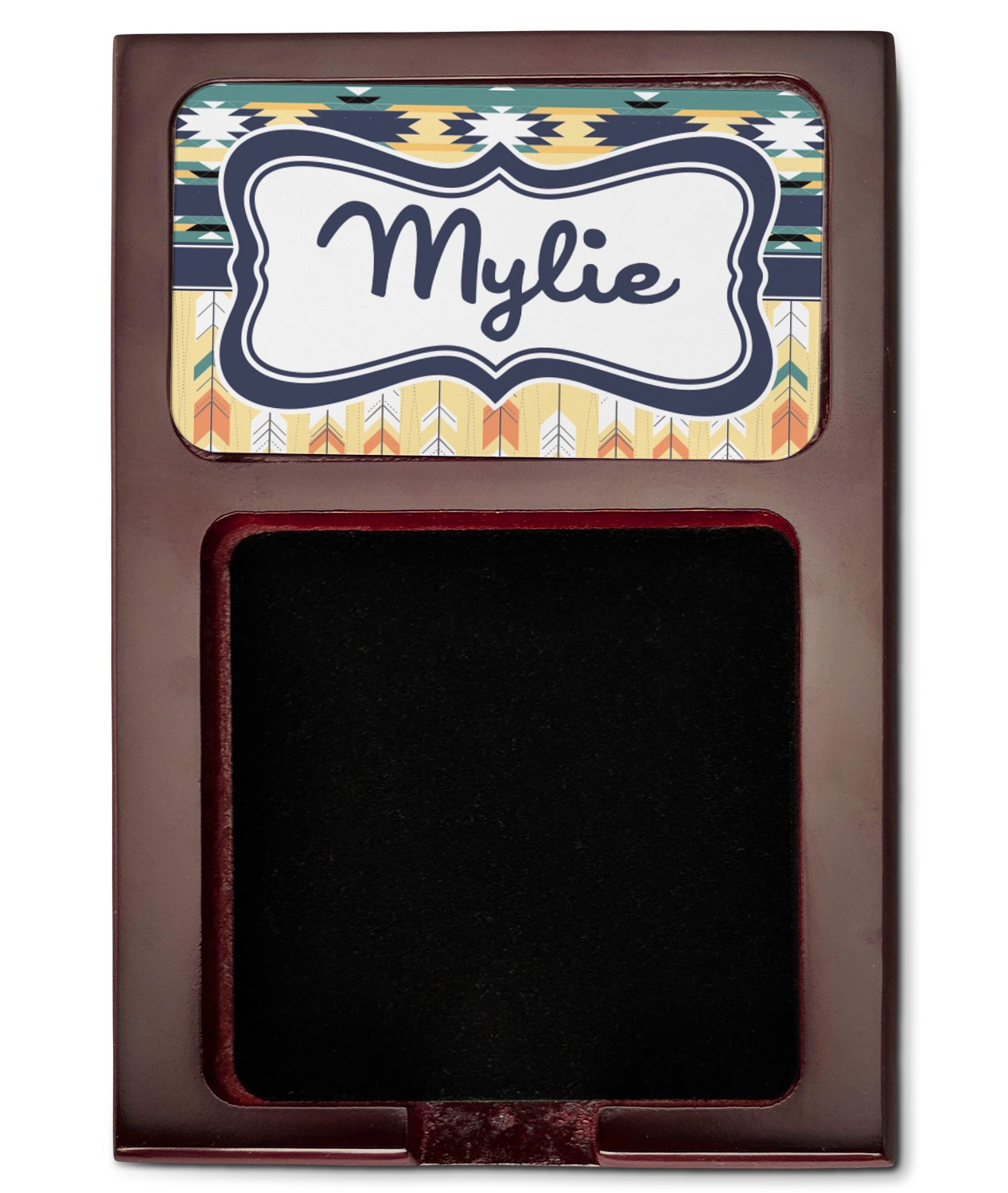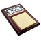 Crafted from a fine mahogany, this post it note holder is in the shade of a dark, cherry color. The dispenser itself is about 4.25 by 6.25 by 0.75 inches. You can place your 3 by 3 inch sticky notes in the indentation below the nameplate. We print your customization onto the nameplate that rests above the velvety indentation.