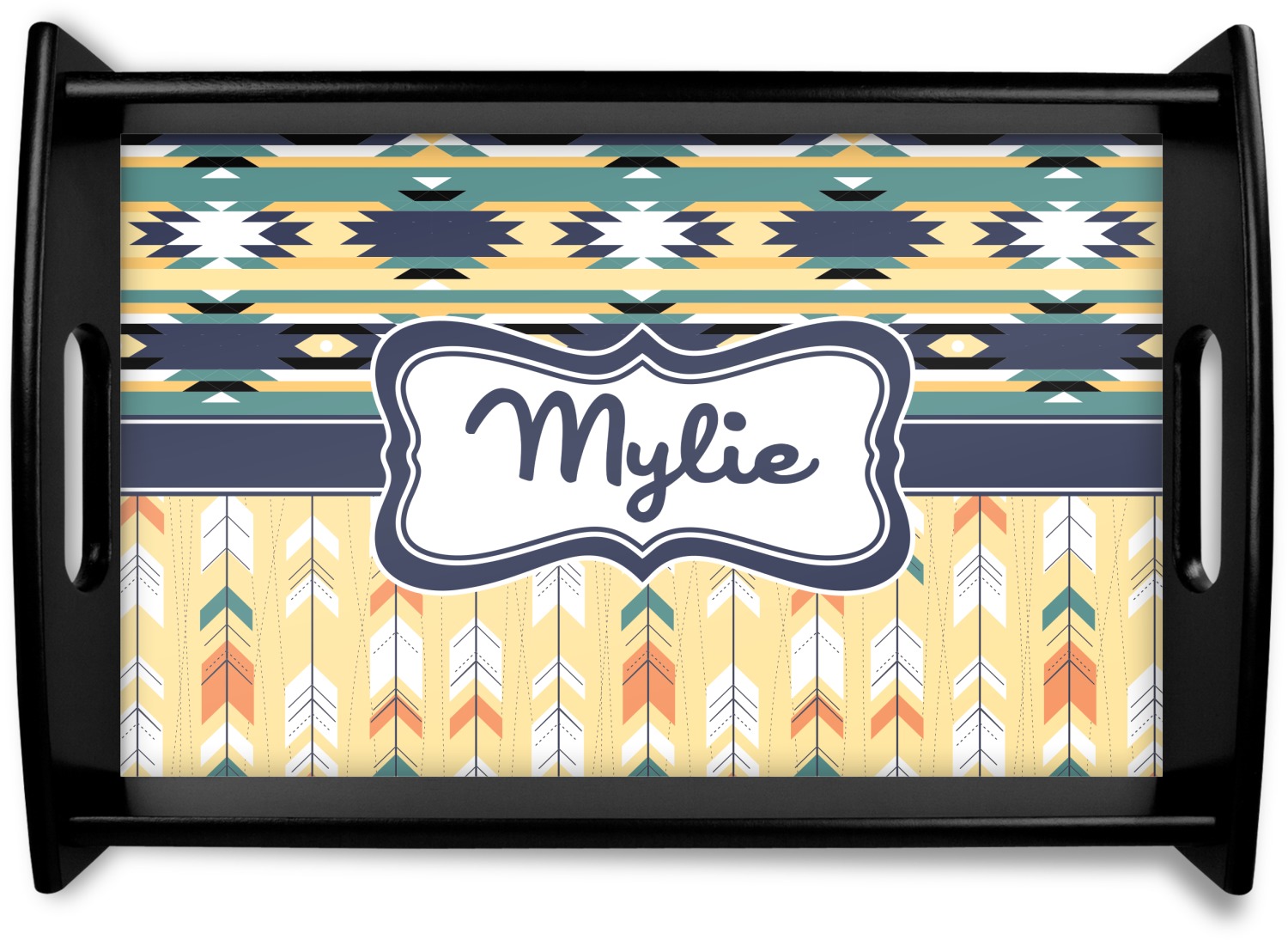 This serving tray with handles features square edges and two rounded sides, creating a very modern look. Each side is fabricated from a beautifully cut, natural wood. The bottom of the interior of the tray displays your customized design in bright, vibrant color. The tray is sold in both a black color and a natural wood look. Each variation of the wood serving tray has two sizes: Small, which is 14" x 10" x 2.25", and Large, which is 19.5" x 13.5" x 2.75".