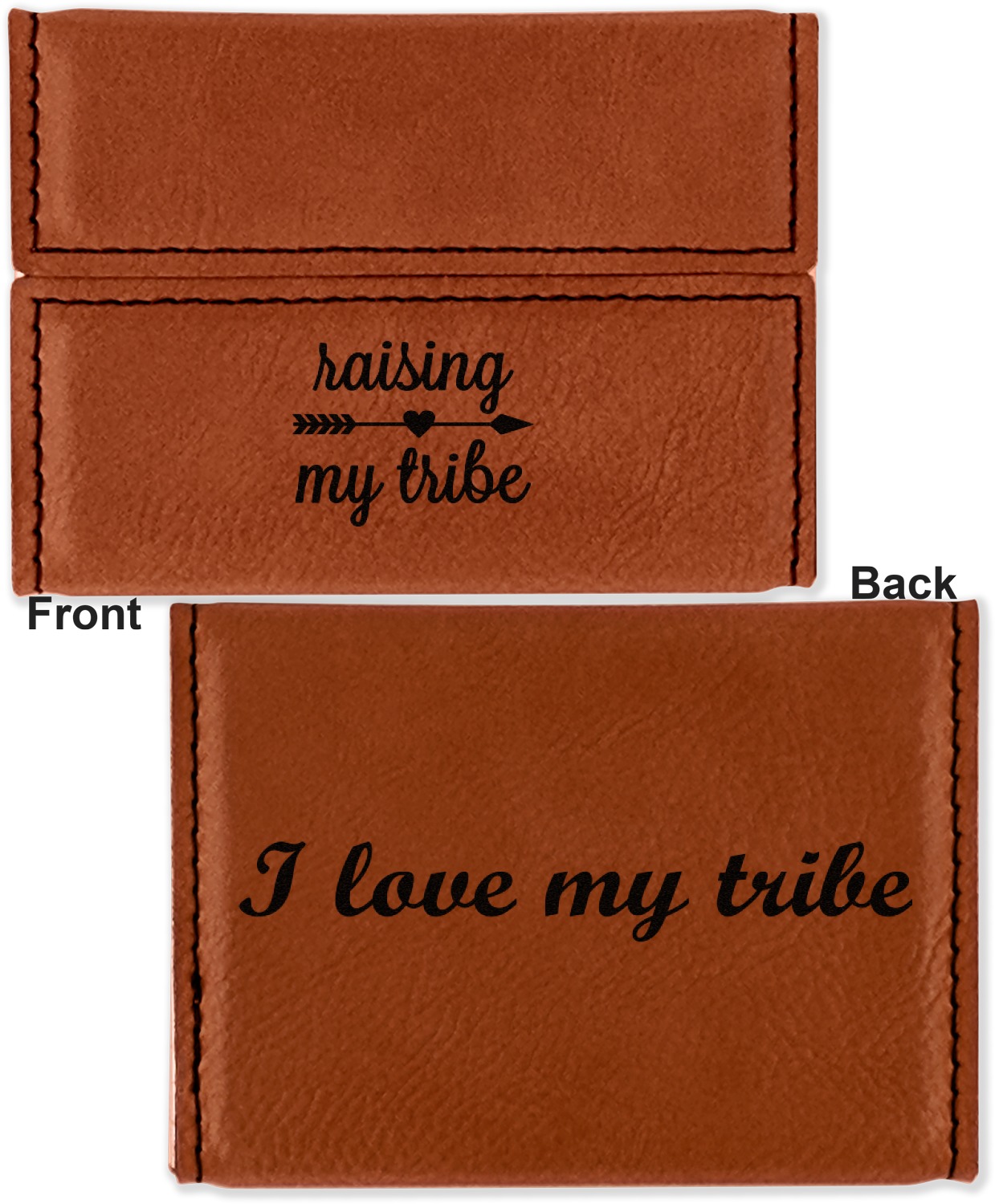 Your personalized design is laser engraved onto either the front, or the front and back of the card holder, depending on the model you purchase. Once engraved, the design will appear a darkened black against the cognac color of the leatherette.