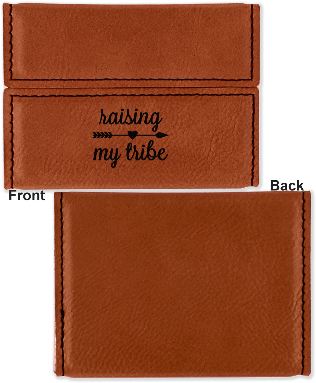 Your personalized design is laser engraved onto either the front, or the front and back of the card holder, depending on the model you purchase. Once engraved, the design will appear a darkened black against the cognac color of the leatherette.