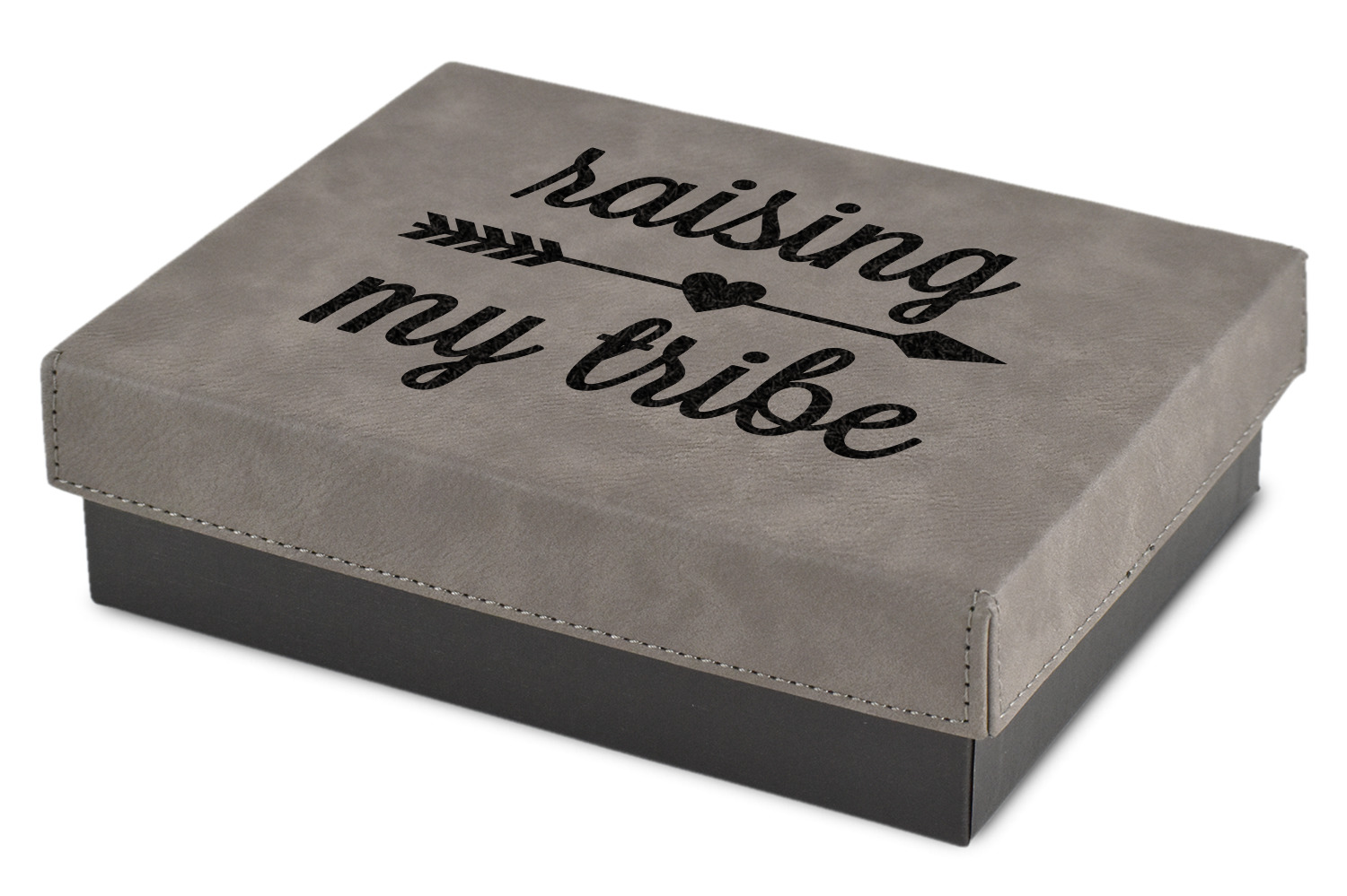These gift boxes are available in 3 different sizes to accommodate various sized gifts. Available in gray as a neutral color for any occasion as well as to showcase your design boldly. Engraved with a laser this high quality paper board and faux leather gift box is unique and makes any gift stand out.