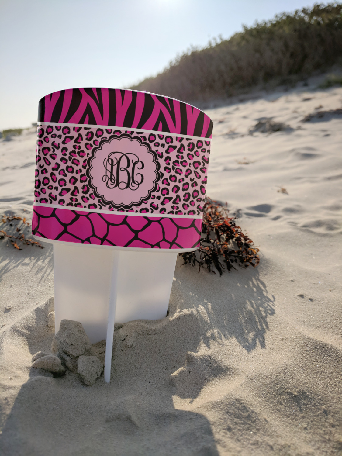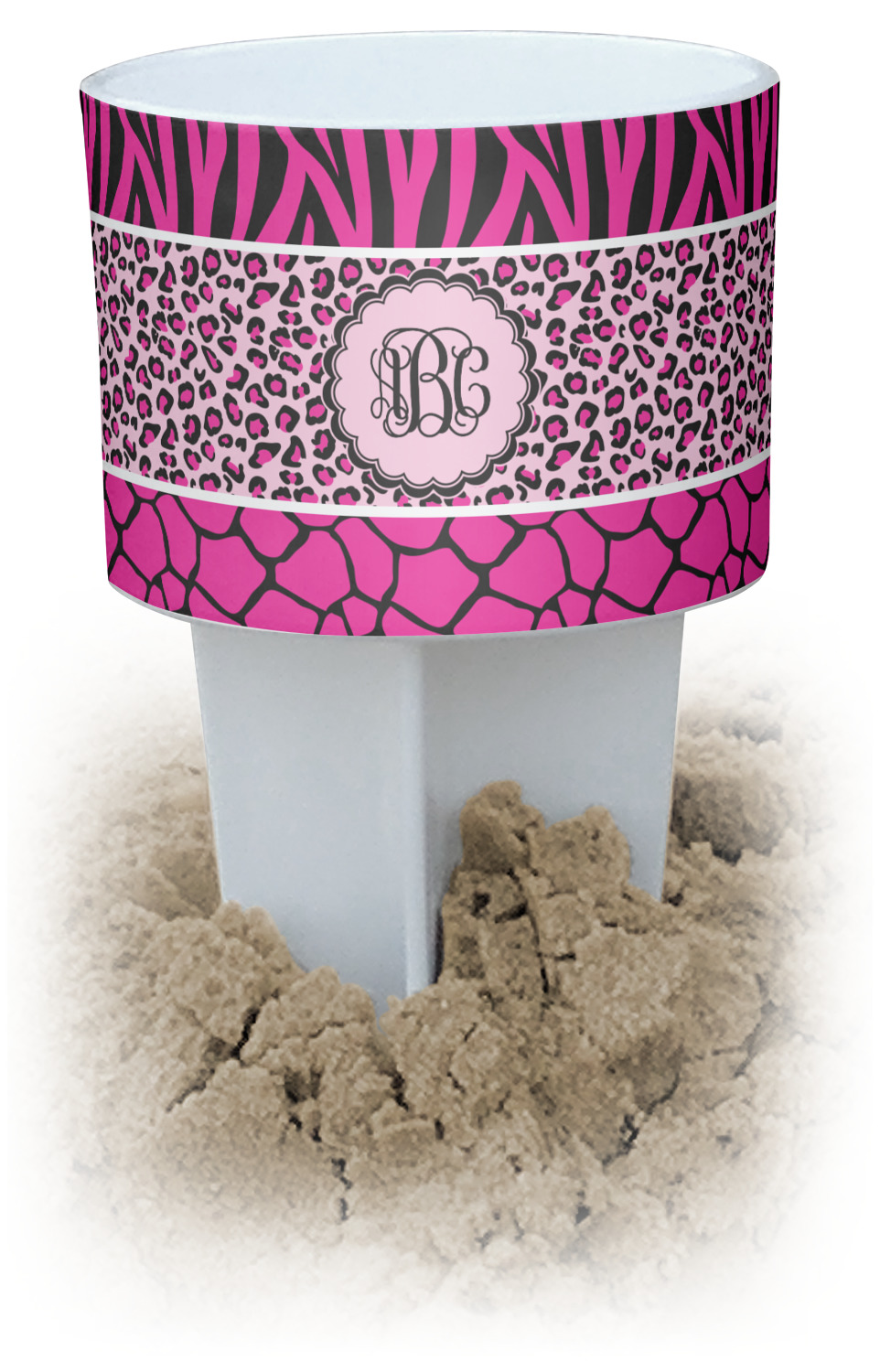 This cup holder has a large stake at its bottom that anchors it to the sand or ground below, while the cup holder rests above the stake. The entire drink holder is made of durable plastic and displays your customization around the cup holder portion. We sell these personalized beach spikers in two different colors: black and white.