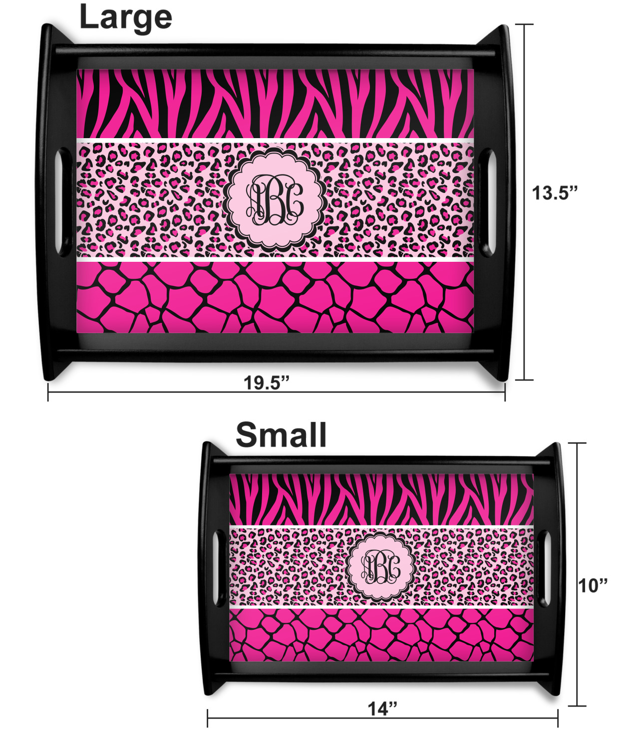 This serving tray with handles features square edges and two rounded sides, creating a very modern look. Each side is fabricated from a beautifully cut, natural wood. The bottom of the interior of the tray displays your customized design in bright, vibrant color. The tray is sold in both a black color and a natural wood look. Each variation of the wood serving tray has two sizes: Small, which is 14" x 10" x 2.25", and Large, which is 19.5" x 13.5" x 2.75".