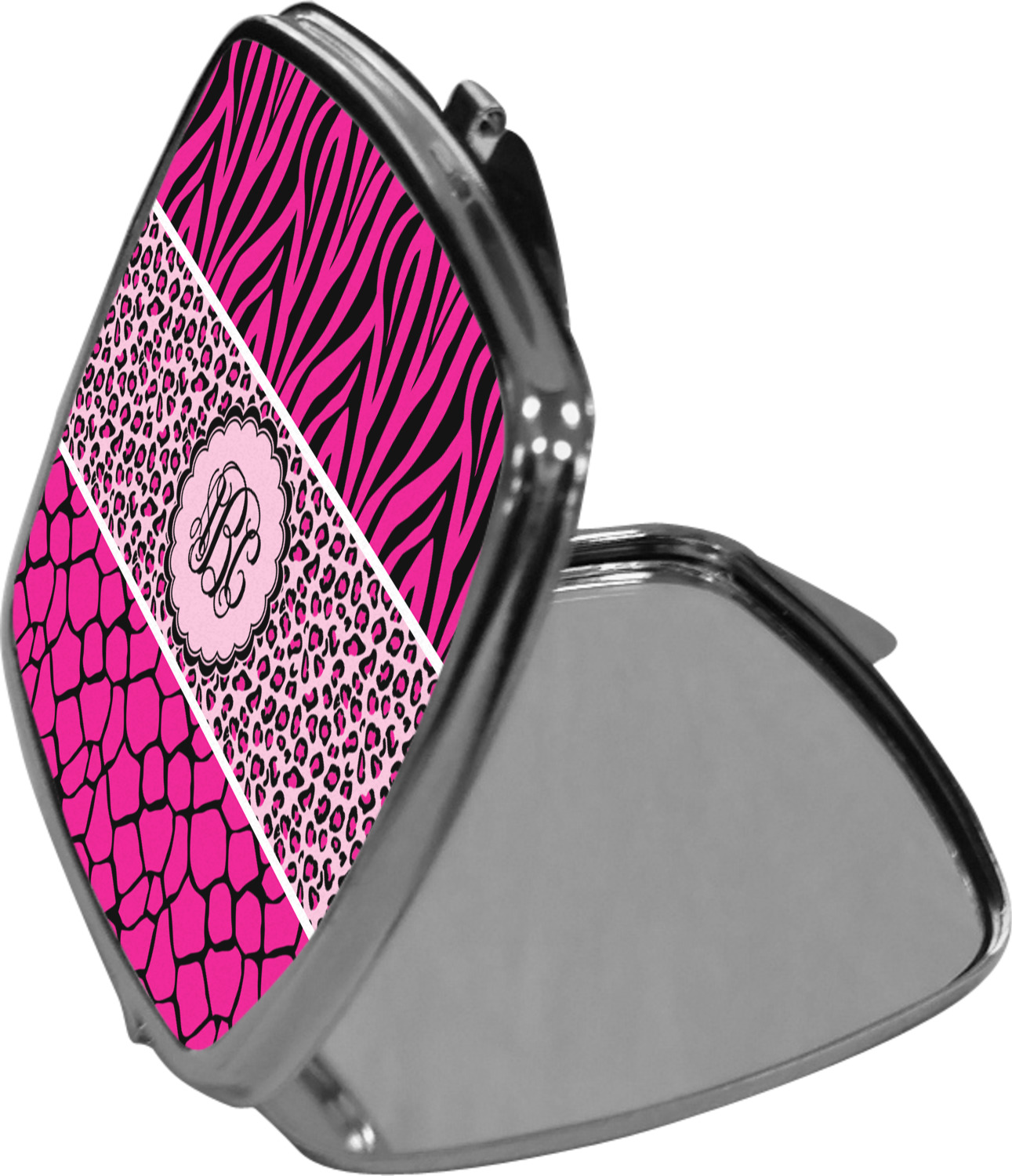 Our compact mirrors are customized with your design on one side. The other side is patterned silver tone metal. Inside, there are two mirrors.