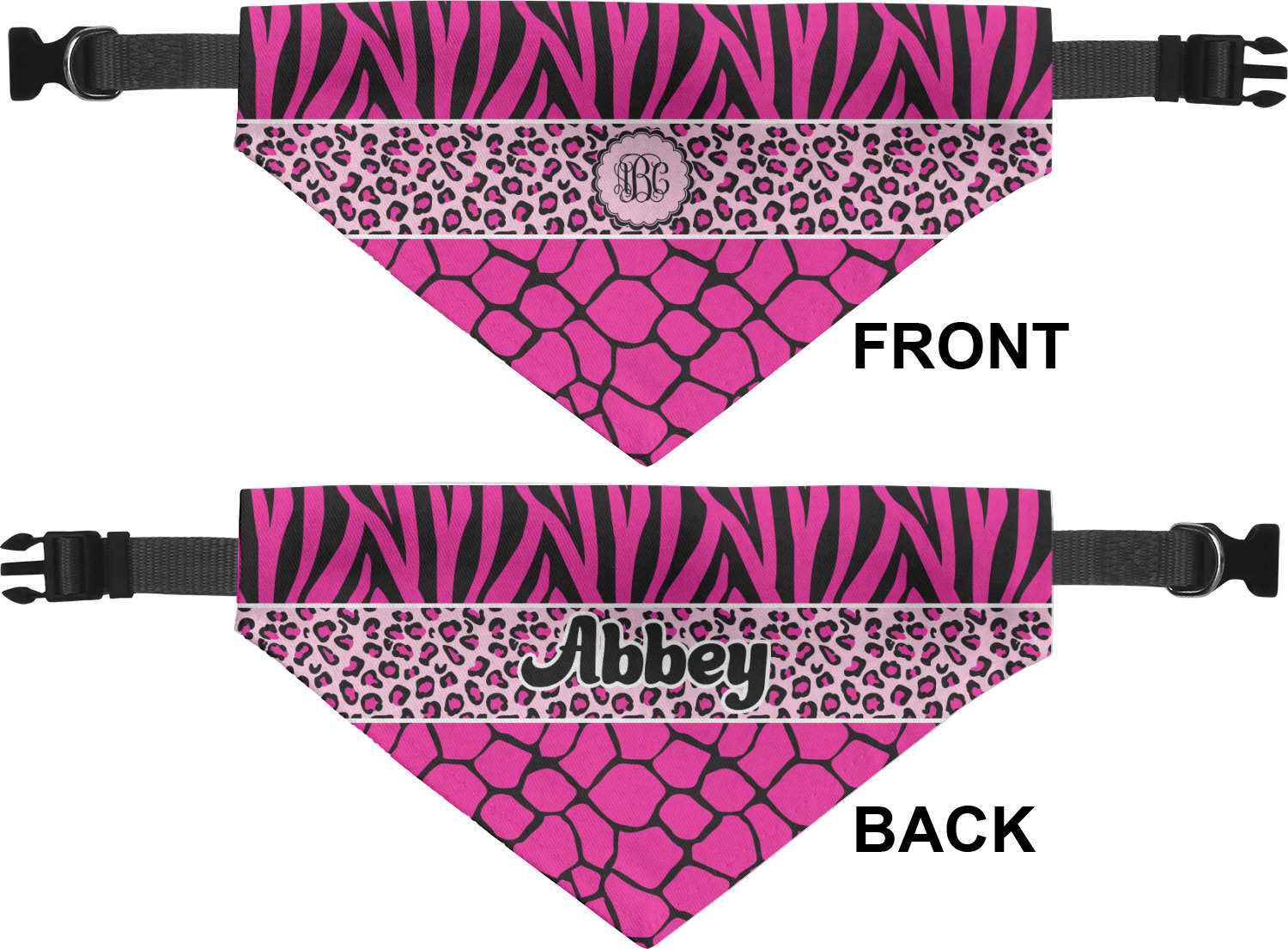 We print the front and back of these dog bandanas with your customized design. The bandana itself is made from a durable polyester, sewn together with a gap large enough to accommodate any collar. Regardless, the bandana includes a plain black, canvas collar with plastic snaps, that can easily be removed if desired. These dog bandana collars are available in four sizes: small, medium, large, and extra large. Please see our sizing chart for more information regarding the dimensions of each size.