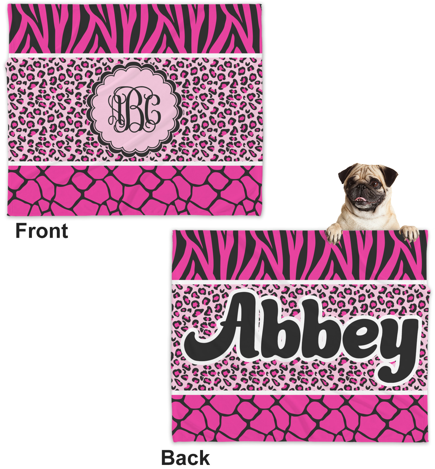 These dog blankets are crafted from a gentle, soft-to-the-touch, minky material. We print your customizations, either matching or differing, on both the top and underside of the blanket. These personalized dog blankets are available in two sizes: regular and large. Our regular size, at 40" x 30", accommodates small and some medium size dogs. At 60" x 50", our large dog blanket is a better fit for bigger breeds. Though specialized for dogs, these blankets still make a thoughtful gift for your favorite feline, or any other pet in mind!