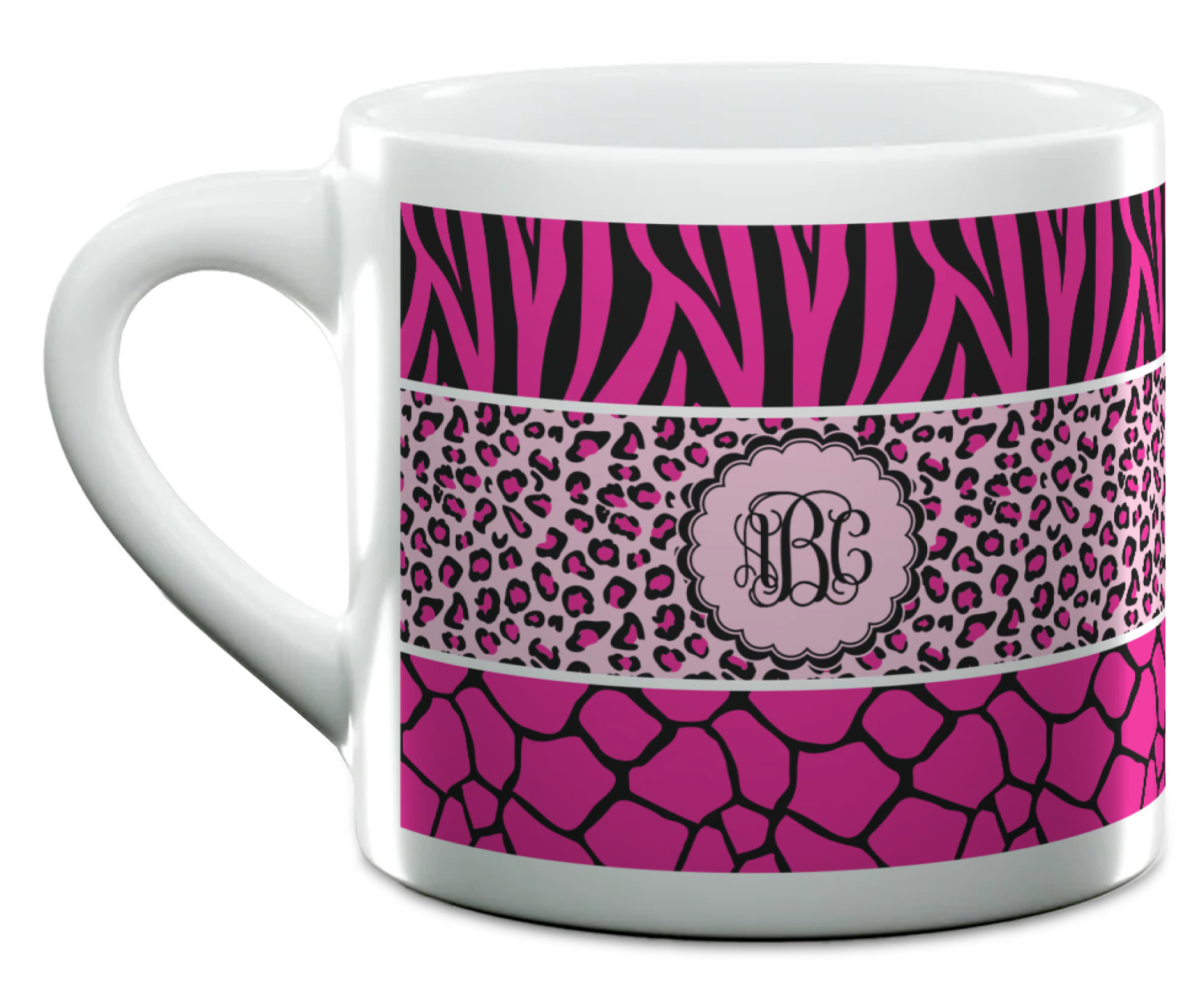 Each of our espresso mugs is a ceramic material sure to keep your drink warm. Personalize one cup for yourself, or order a set of 4! Its the perfect little gift for any coffee lover! We carry two sizes for you to personalize - 3 oz. (approx. 3.25" x 2.325" x 2.625") or 6 oz. (approx. 4" x 2.9" x 2.9"). Our 3 oz. mug is perfect for that single shot espresso while our 6 oz. mug can be your next favorite cappuccino cup holding two shots of espresso!