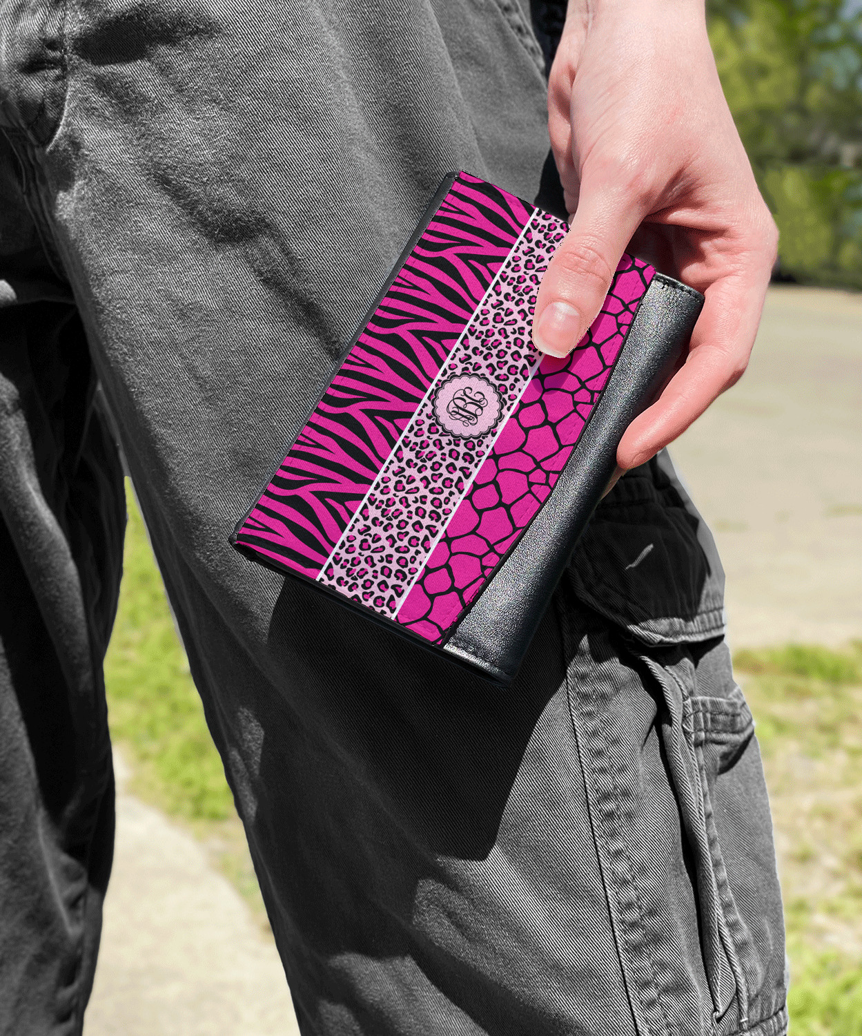 This over top triple animal prints (zebra, leopard & giraffe) is definitely for the person who LOVES animal prints. The design has zebra print on top, leopard print in the middle and giraffe print on the bottom. We chose to feature this design in black, hot pink and baby pink, however, the design is completely re-color-able, so you are able to select any color combinations you desire. Also the order of the pattern is also customizable.