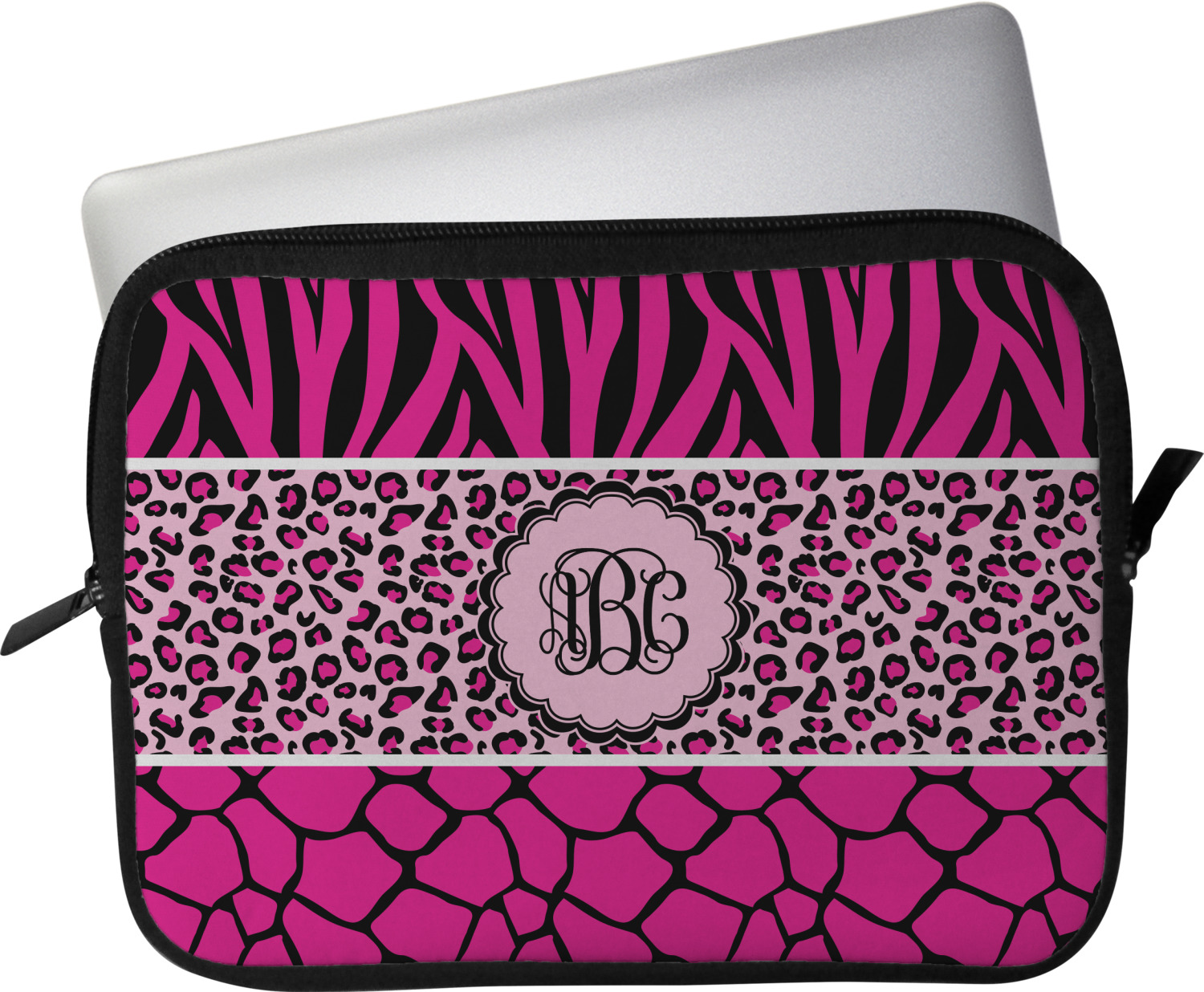 These laptop covers are built from a water-resistant, cushioned neoprene. We display your personalized design on the front of this computer sleeve, while the other sides are simply the black color of the neoprene fabric. A zipper lines the top half of this case, for direct access to your device. For added protection, the interior of this neoprene laptop sleeve is lined with a padded, minky-like material.