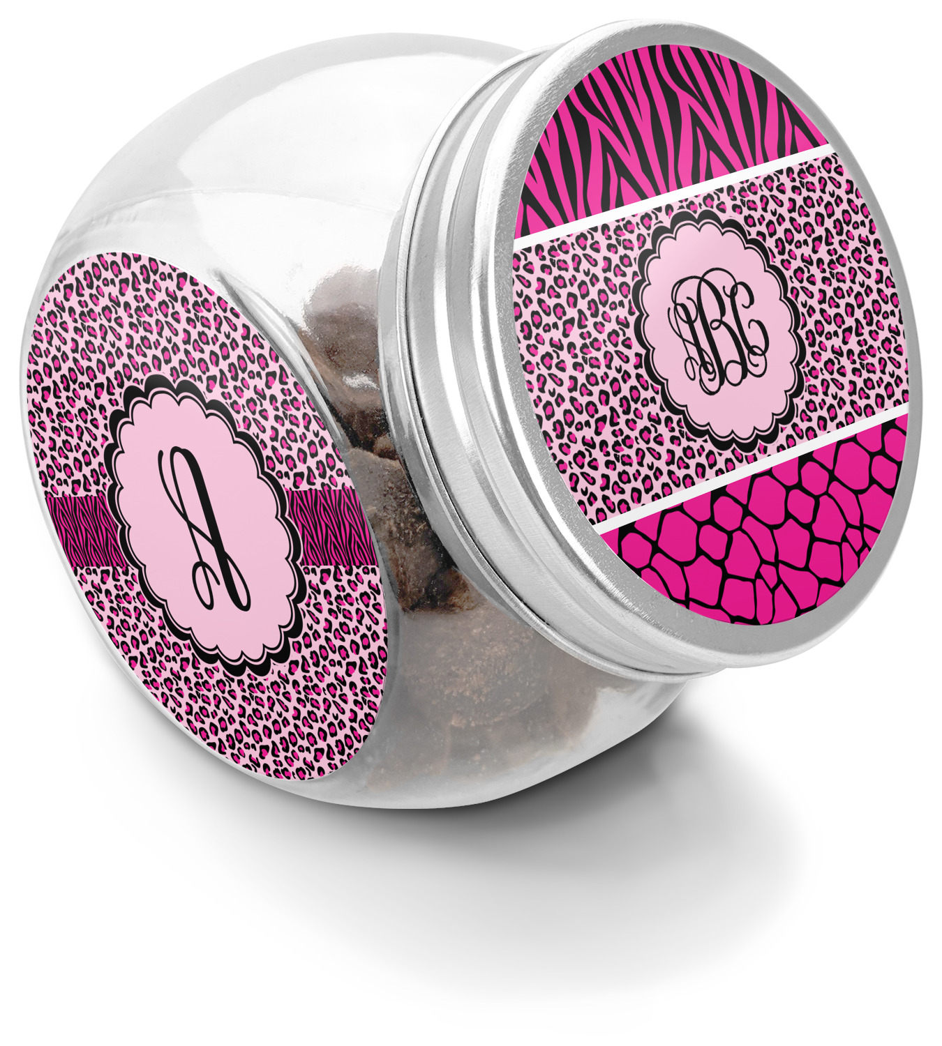 This treat jar is an excellent way to store treats for your favorite canine or feline. Moreover, their delicate, classy appearance makes them a tasteful addition to your countertop's décor. Crafted from clear glass, its unique construction and silver metal, screw-on lid allows for quick and easy access. Three, permanent, vinyl stickers are applied to both sides of the jar and lid, presenting your personalized design. The base of this glass, dog treat jar is 3.4" x 4.75", and the jar stands at 5" tall. Though on the smaller side, this jar is best suited for smaller treats or training treats.